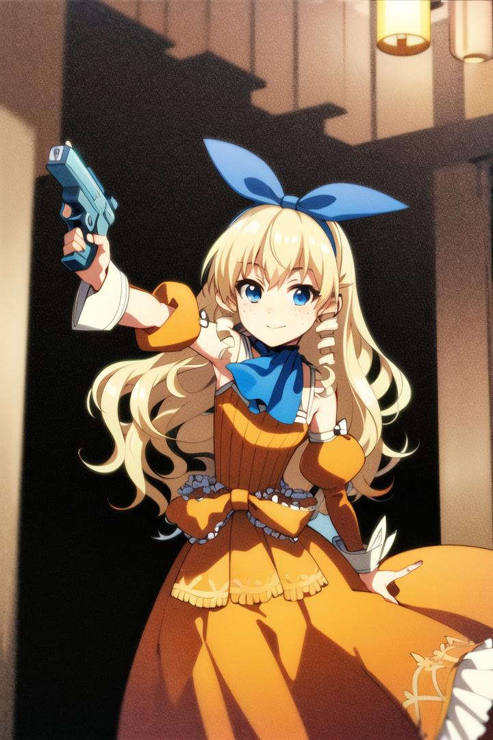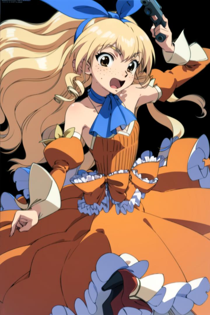 Trigger Words: jane maxwell, (freckles:0.8), blonde hair, long hair, hair bow, blue ascot, orange dress, long skirt,