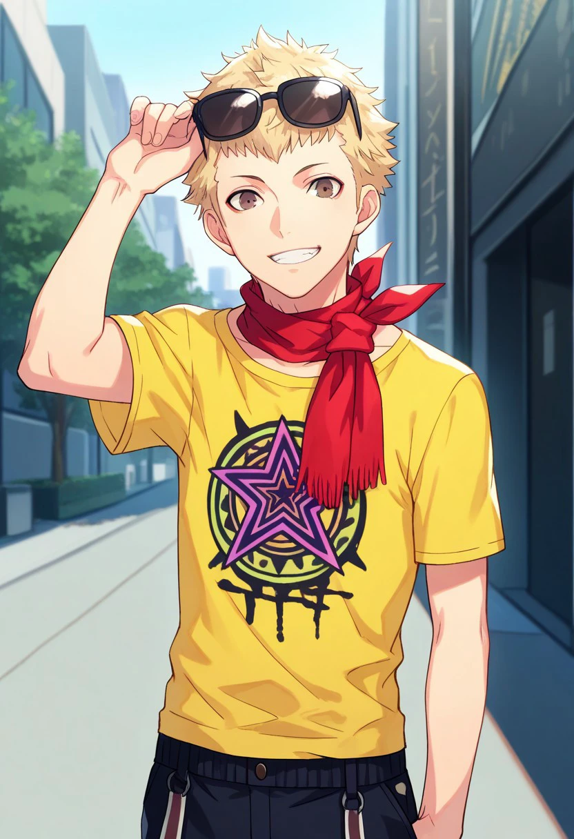 ryuji, 1boy, male focus solo, brown eyes, blonde hair, short hair, sunglasses, eyewear on head, shirt, t-shirt, yellow shirt, print shirt, short sleeves, scarf, red scarf, belt, pants, plaid, plaid pants, shoes, yellow footwear,jewelry, bracelet,