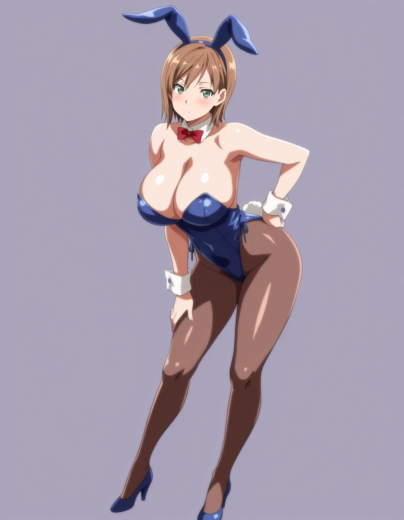 mai_imar,mai_yuriim,short_hair,brown_hair,green_eyes,large_,cleavage,_shoulders,pantyhose,red_bow,wrist_cuffs,detached_collar,playboy_,rabbit_tail,red_bowtie,strapless_leotard,blue_leotard