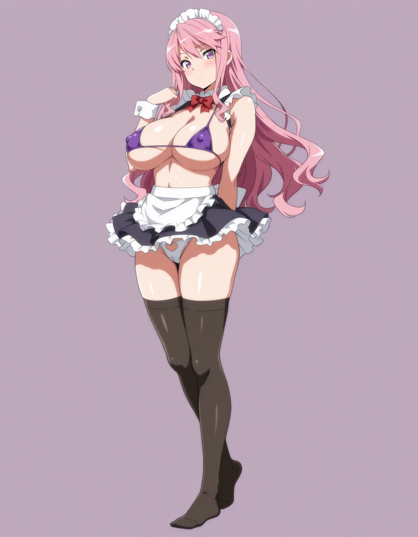 mai_imar,mai_seikaim,long_hair,pink_hair,purple_eyes,large_,cross_necklace,purple_shirt,t-shirt,black_jacket,sleeves rolled up,white_skirt,high_heels,cleavage
