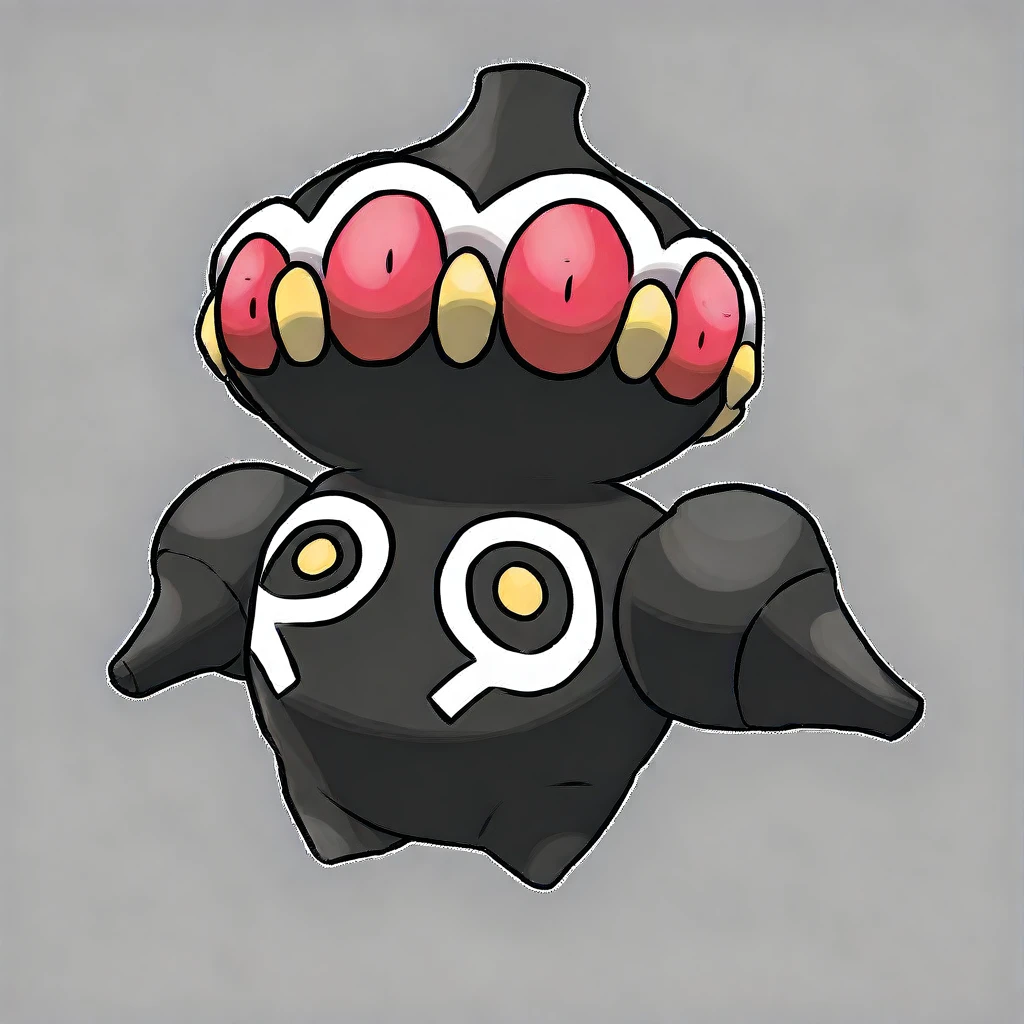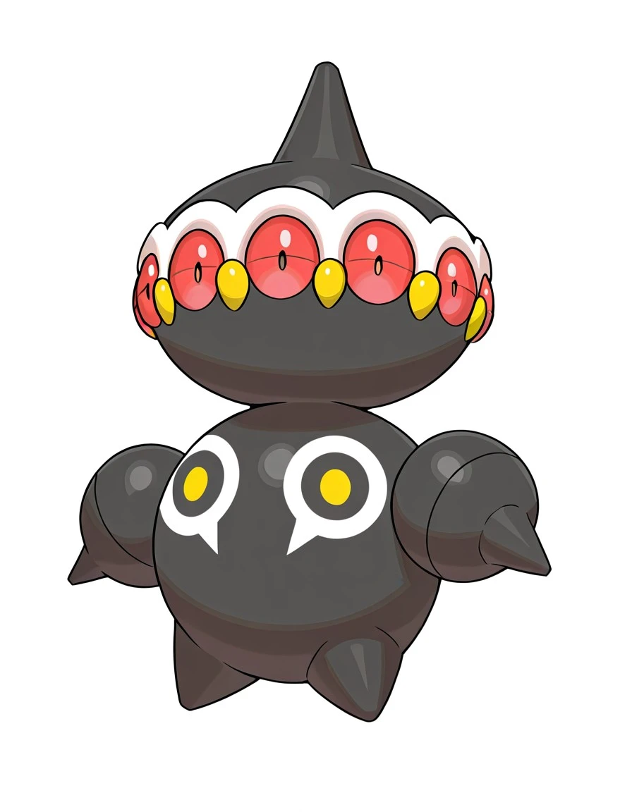 CL4YD0L, black body, multiple eyes, pointed head, tricolor head, red eyes, white markings around the eyes, round body, white markings with yellow dots on the chest, urn-shaped arms, small pointed feetThe model is not always perfect so... you may try more than one time for the perfect image.
