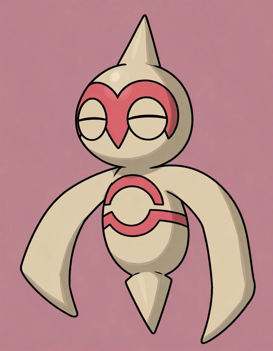 B4lt0Y, beige skin, light beige eyes, red mark on the face, pointed head, eyes closed, round body, arms without fingers, no legs, pointed lower body, red mark on the stomach, Claydol :