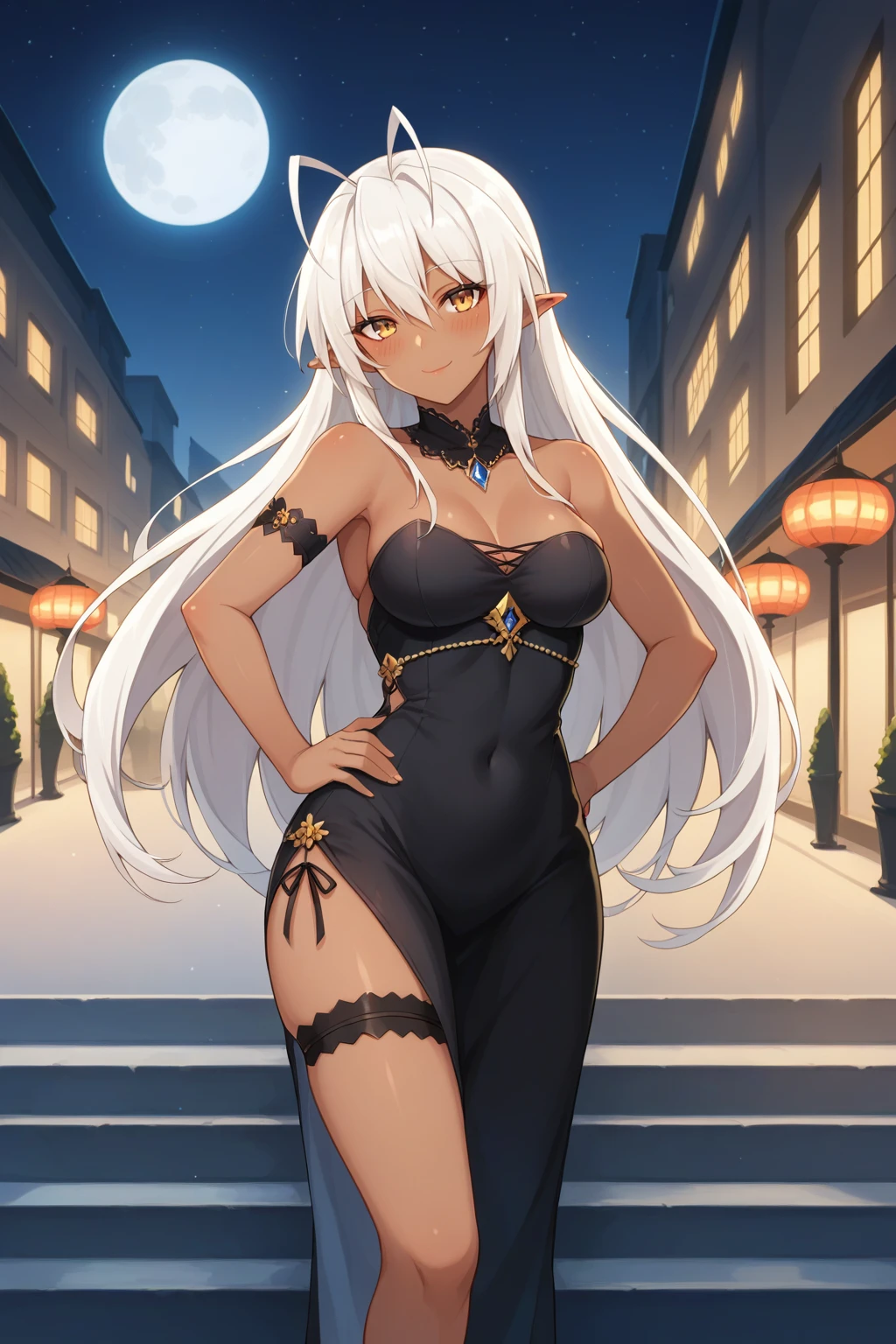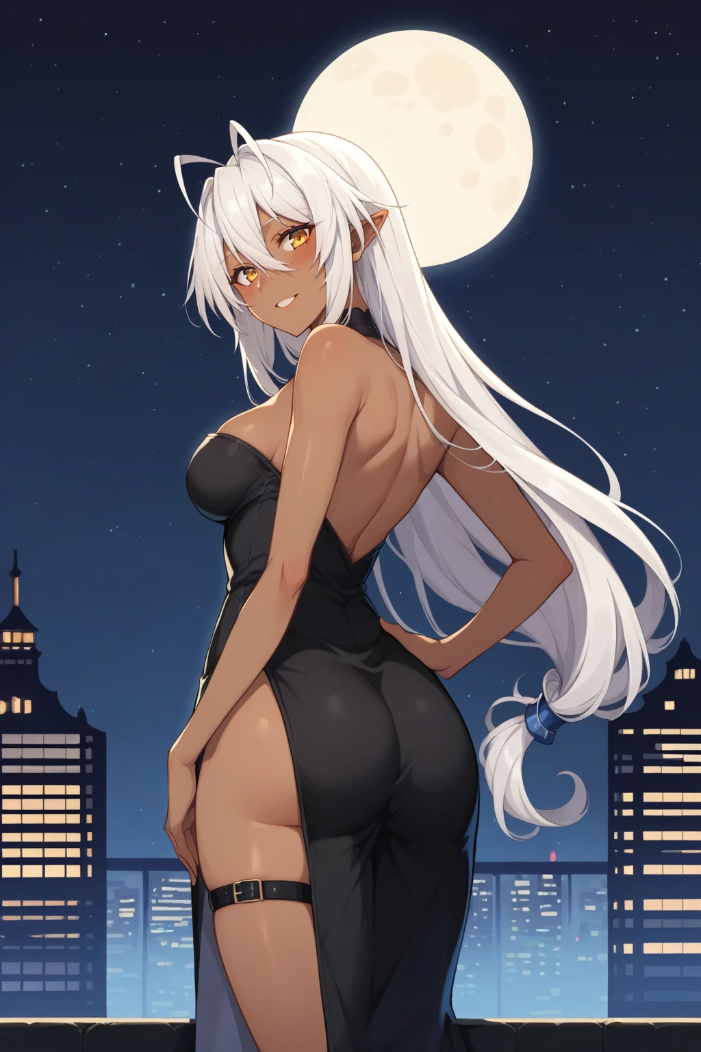 KJOsansei, long hair, white hair, yellow eyes, hair between eyes, dark-skinned female, pointy ears, antenna hair,