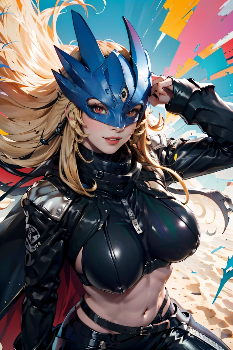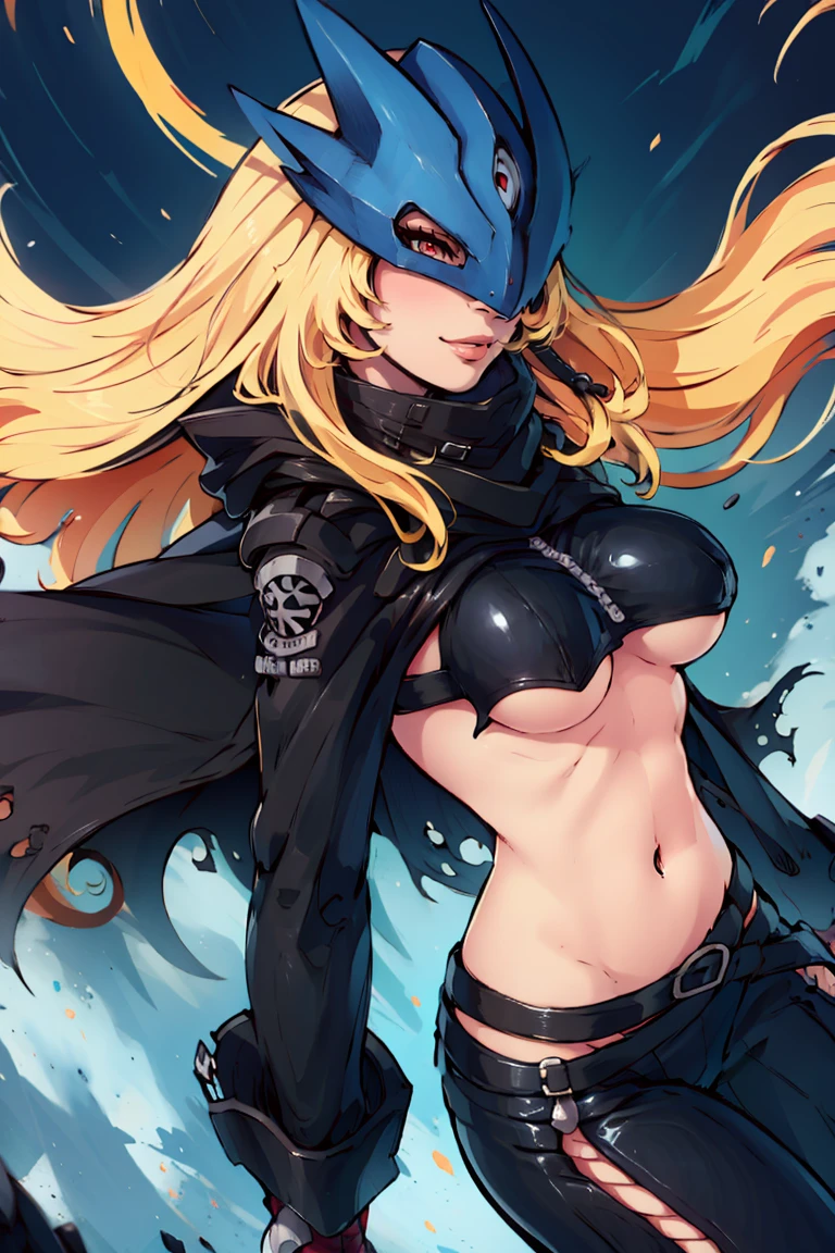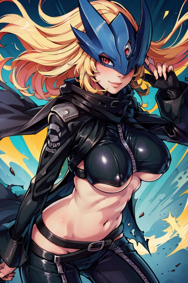 Beelstarmon_Digimon, 1girl, solo, blonde hair, large breasts, red eyes, sidelocks, third eye, mask, long sleeves, navel, open clothes, midriff, black jacket, torn clothes, underboob, black pants, zipper, black belt, black scarf, cape,