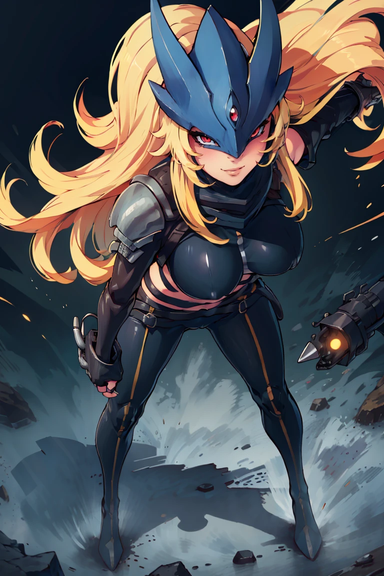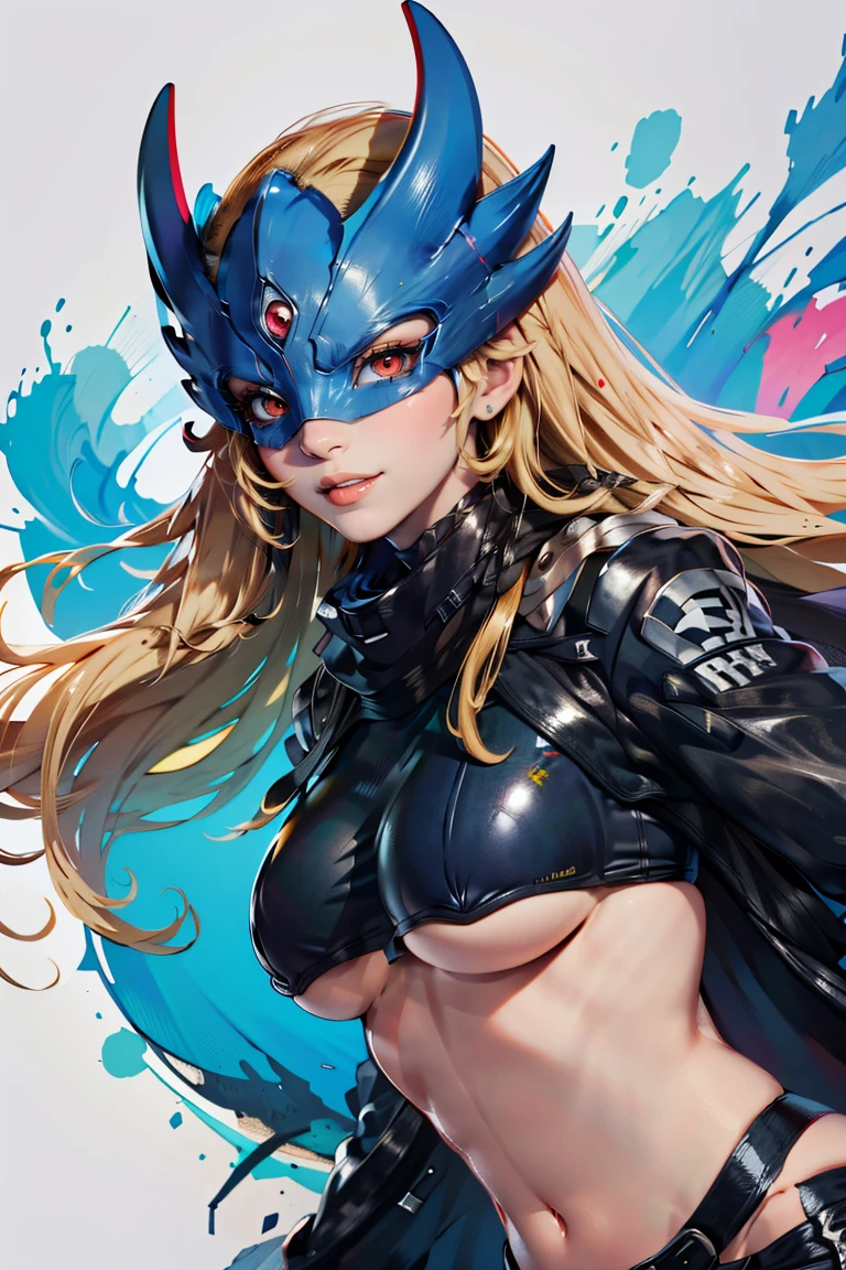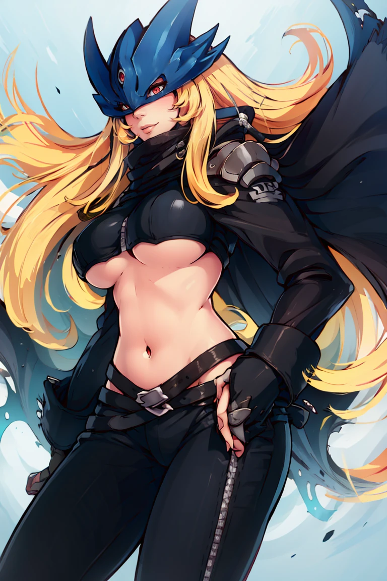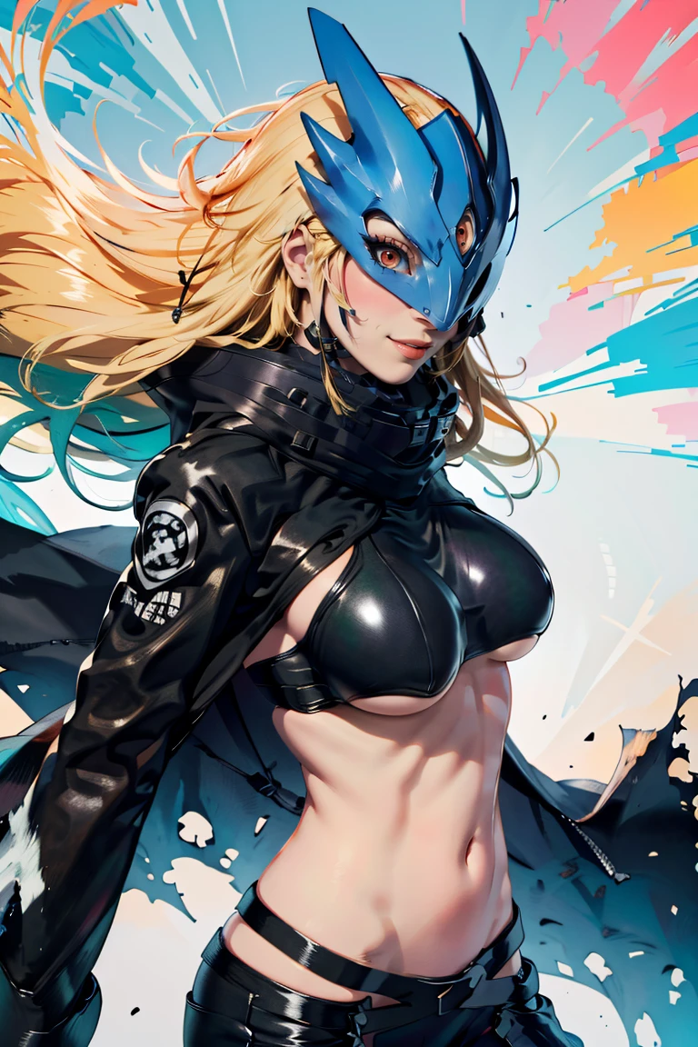 Beelstarmon_Digimon, 1girl, solo, blonde hair, large breasts, red eyes, sidelocks, third eye, mask, long sleeves, navel, open clothes, midriff, black jacket, torn clothes, underboob, black pants, zipper, black belt, black scarf, cape,