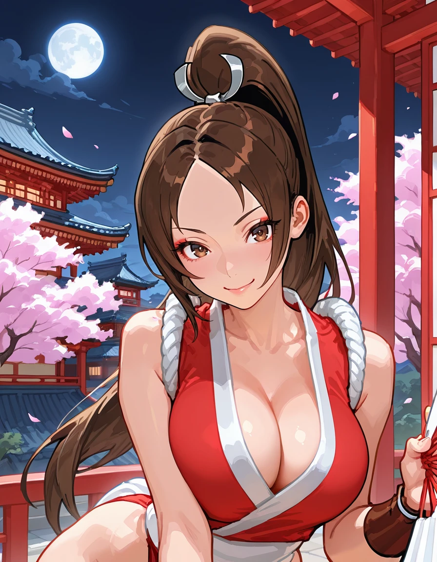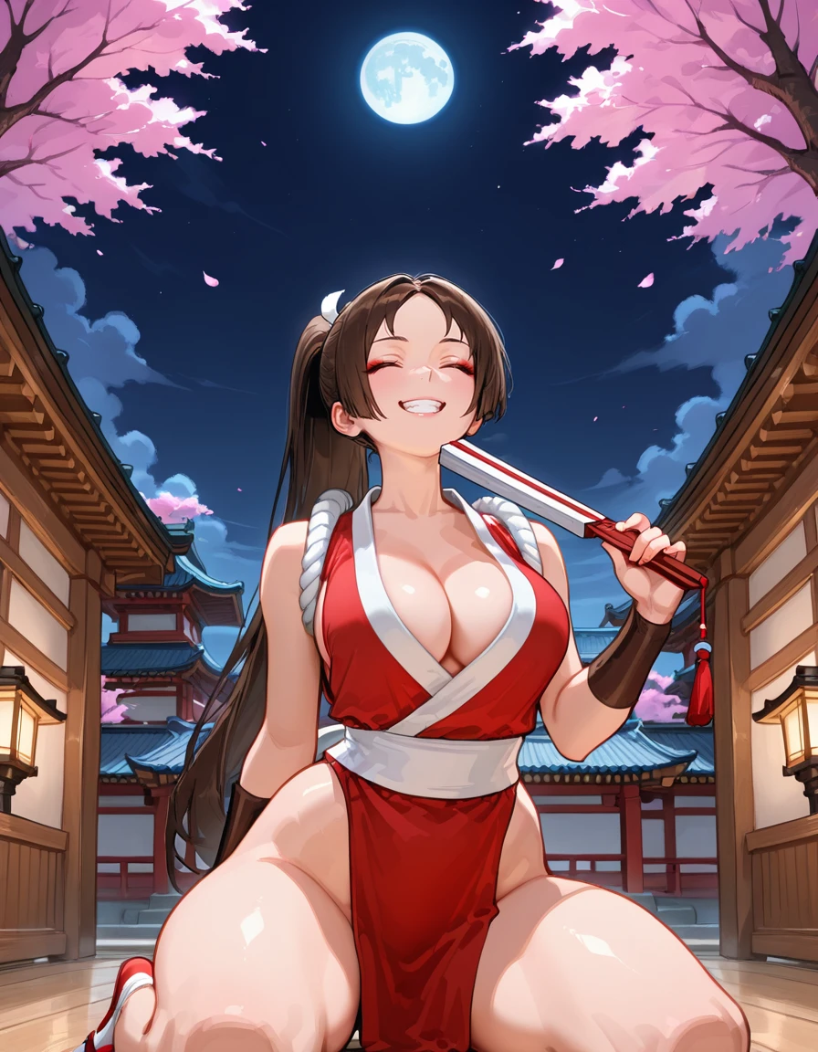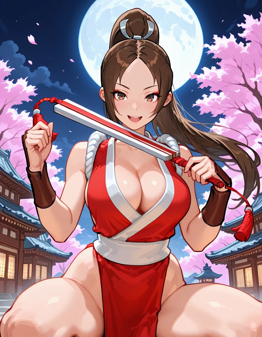 (cvs2000-shiranui-mai), (brown eyes, outer corner eyeshadow, brown hair, parted bangs, long hair, ponytail, white hair tie, large breasts, cleavage, wide hips, thick thighs), (ninja, red short kimono, sleeveless, side cutout, white tasuki, white sash, red pelvic curtain, red highleg buruma, red arm guards, red fake tail, white fake tail, red tabi)