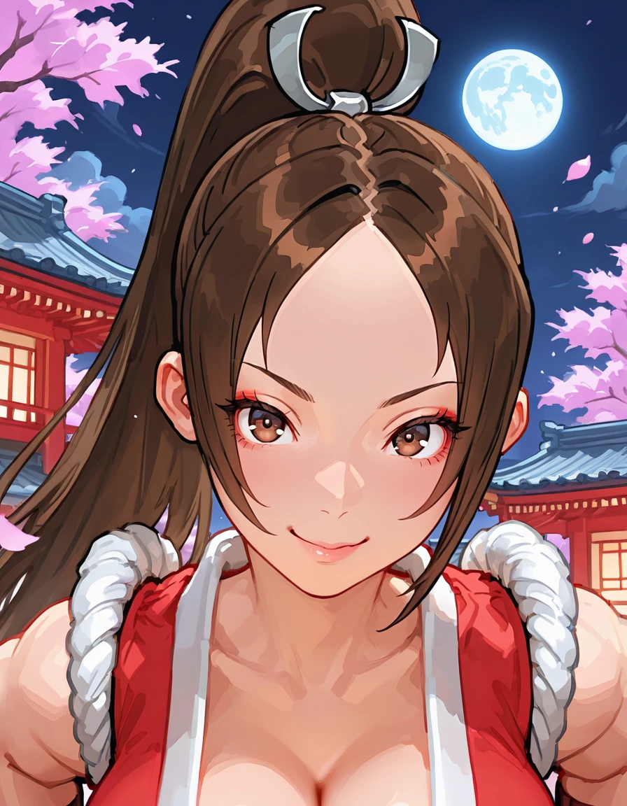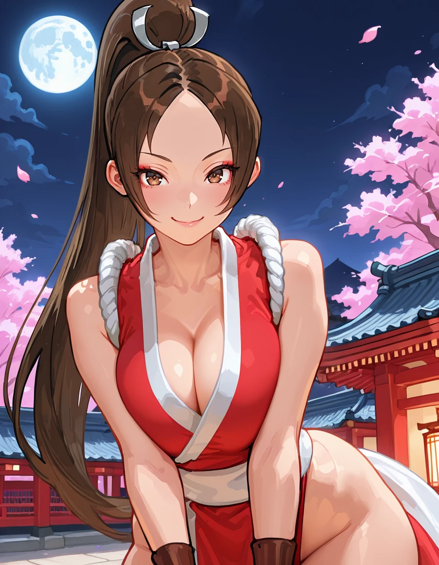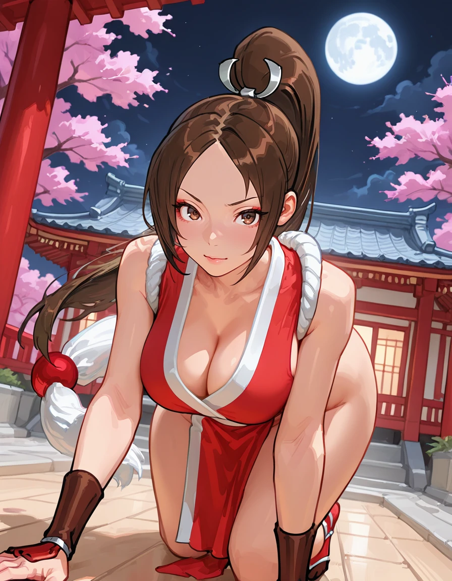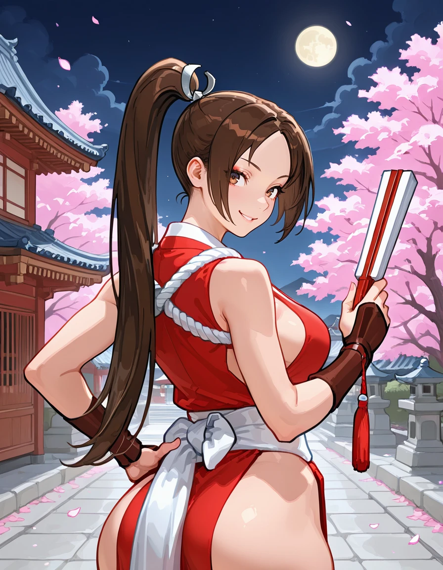 (cvs2000-shiranui-mai), (brown eyes, outer corner eyeshadow, brown hair, parted bangs, long hair, ponytail, white hair tie, large breasts, cleavage, wide hips, thick thighs), (ninja, red short kimono, sleeveless, side cutout, white tasuki, white sash, red pelvic curtain, red highleg buruma, red arm guards, red fake tail, white fake tail, red tabi)