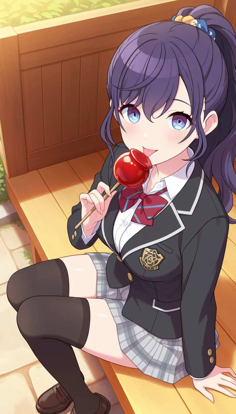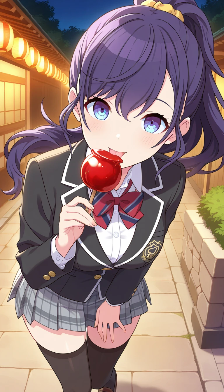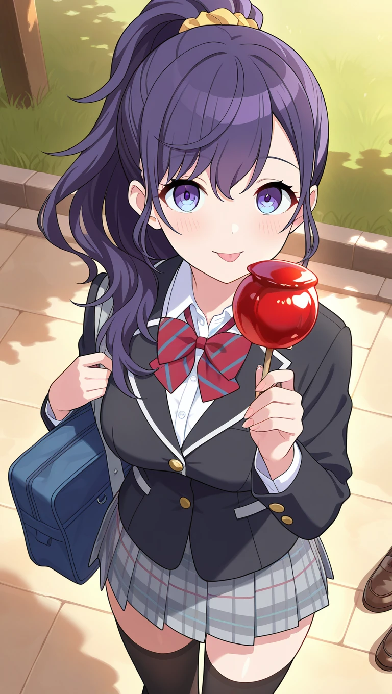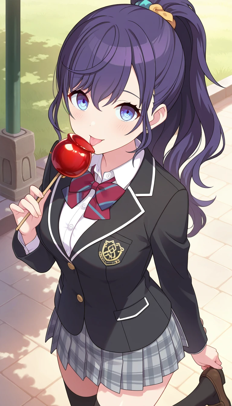 school uniform,black jacket,buttons,white shirt,dress shirt,collared shirt,red bowtie,diagonal-striped bow,long sleeves,medium breasts,grey skirt,plaid skirt,pleated skirt,thighs,zettai ryouiki,black thighhighs,loafers