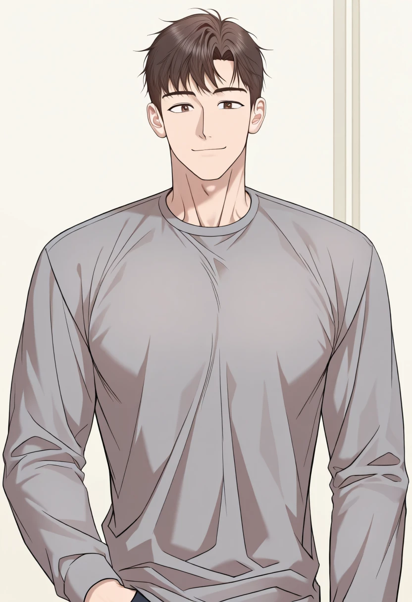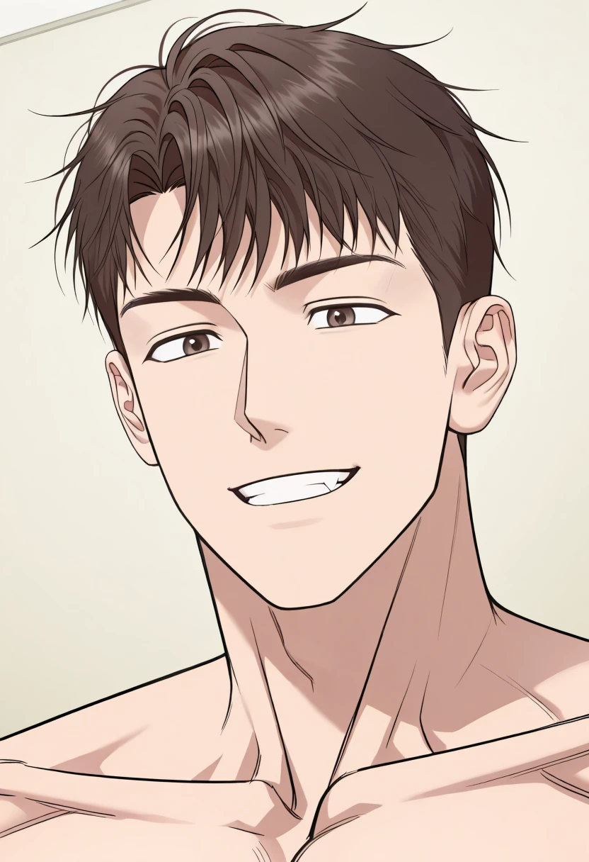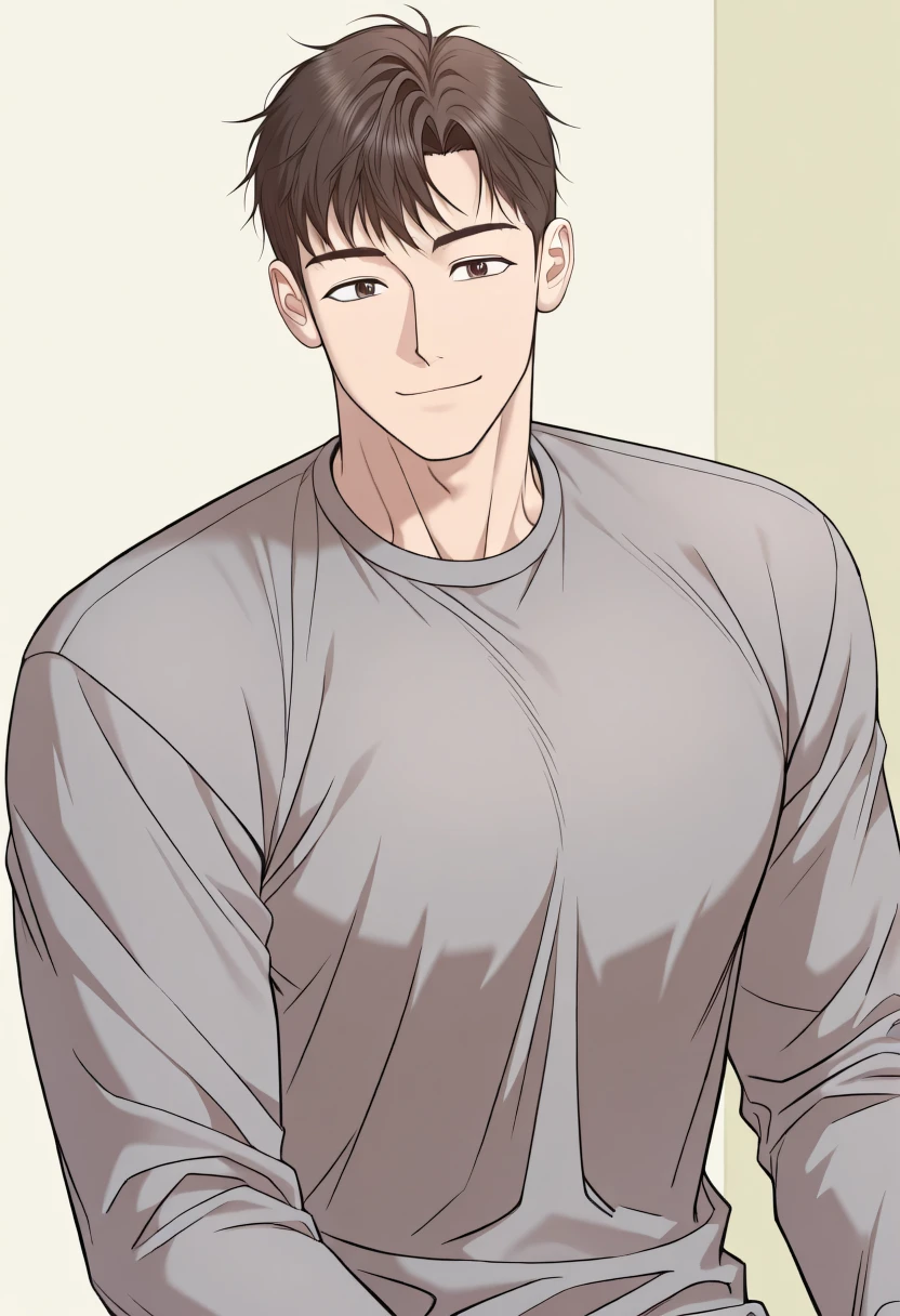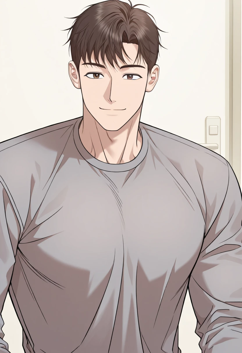 Current appearance: Taehyun, brown hair, short hair, brown eyes, large pectorals,