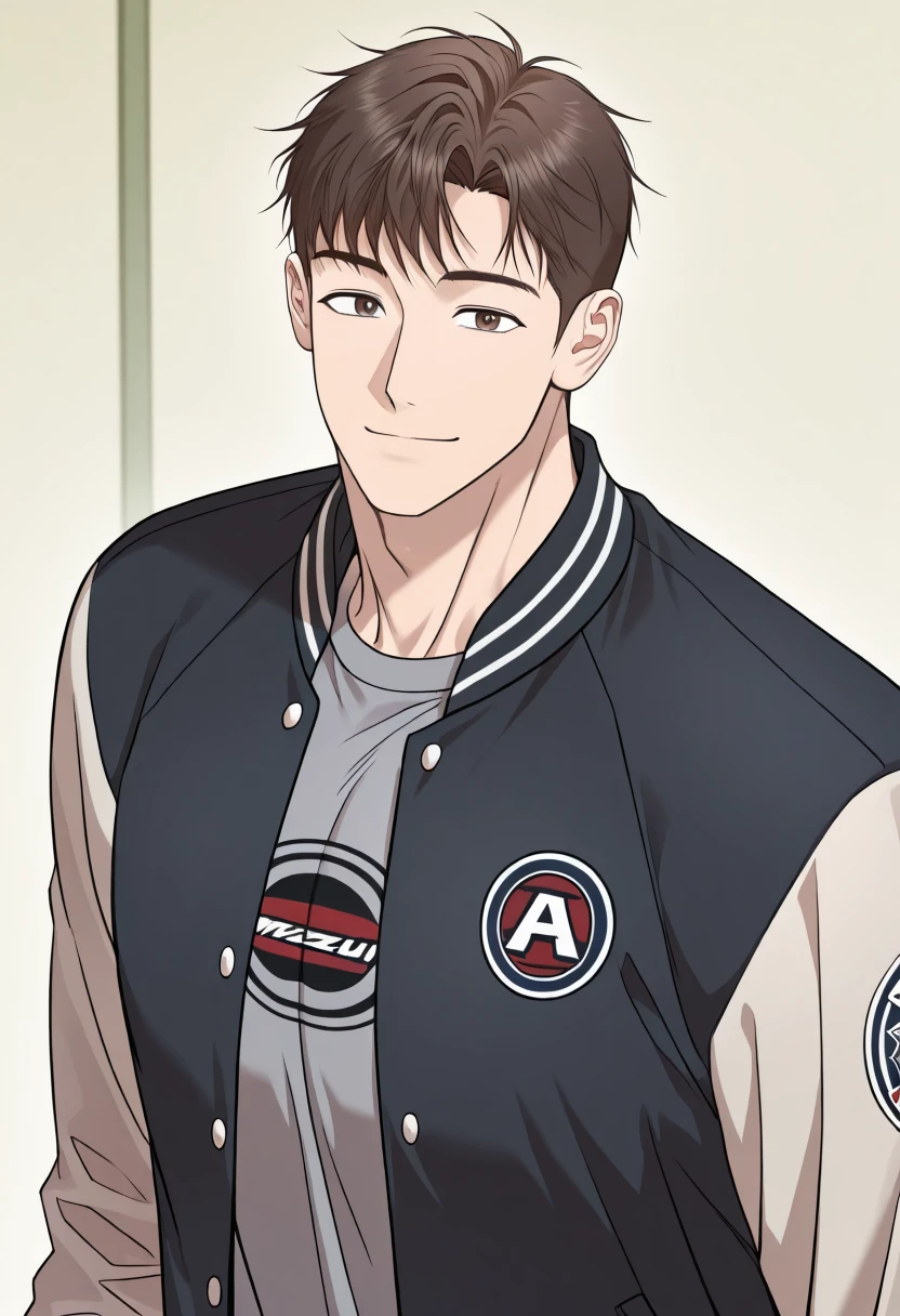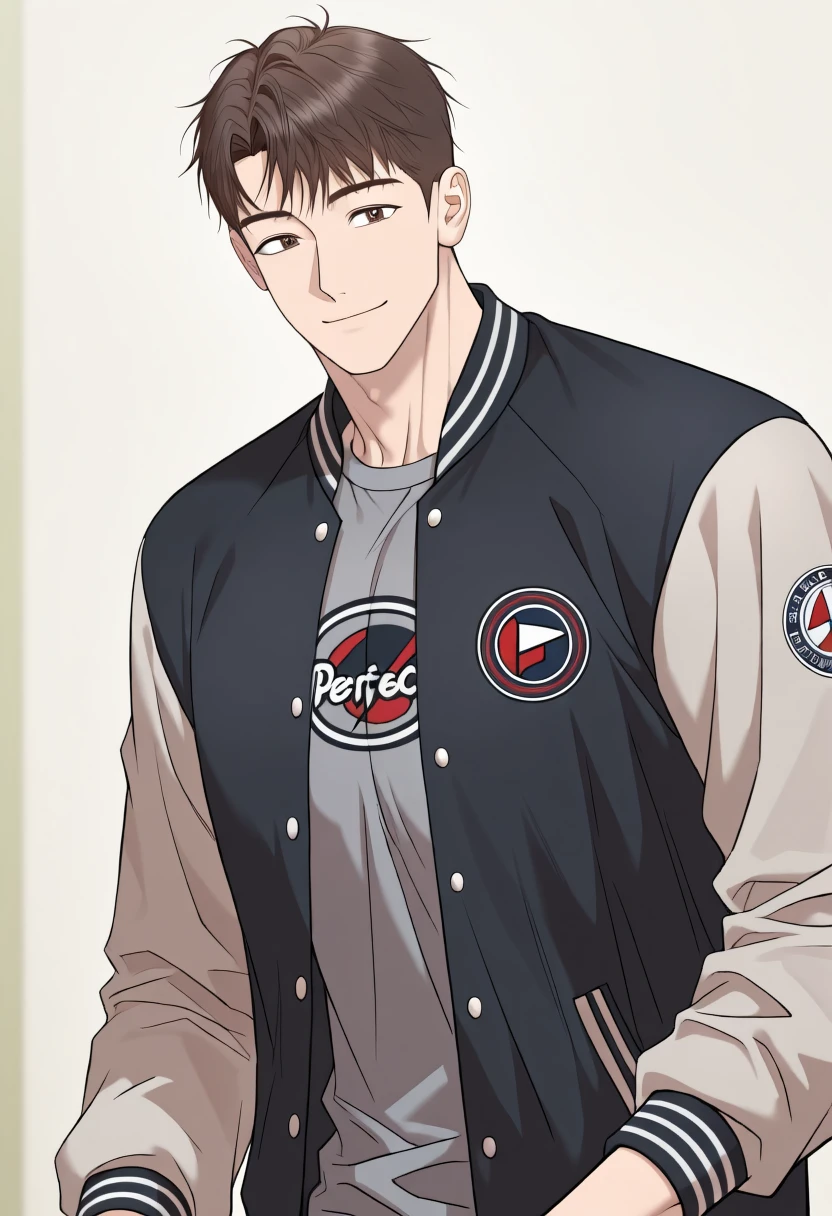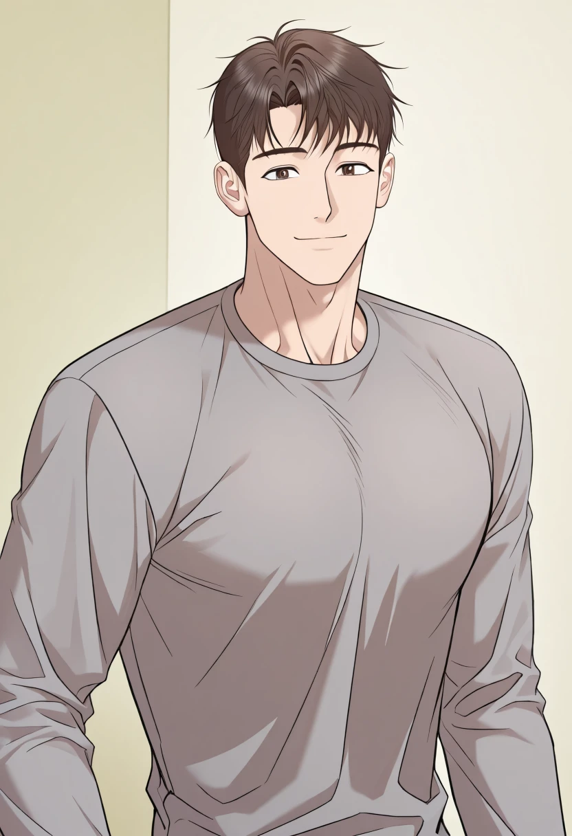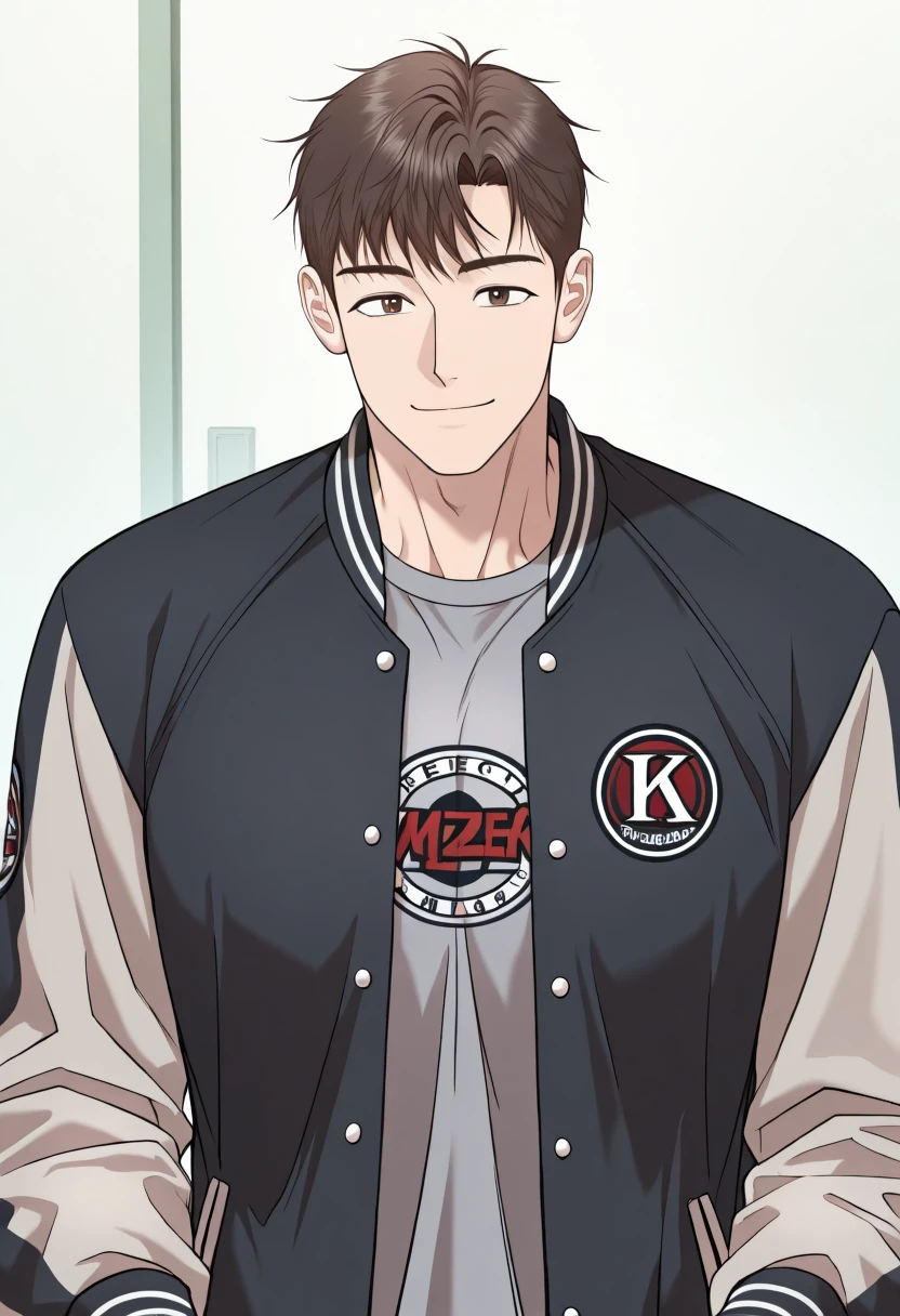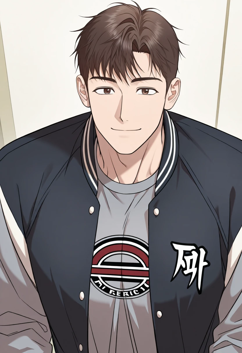 Current appearance: Taehyun, brown hair, short hair, brown eyes, large pectorals,