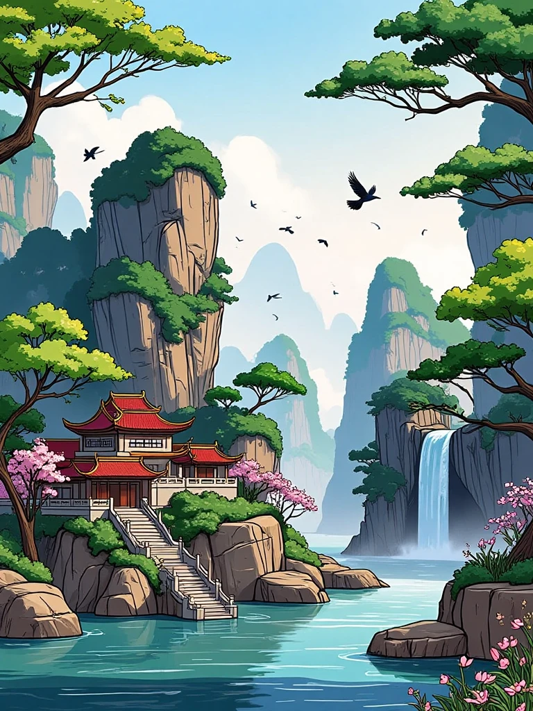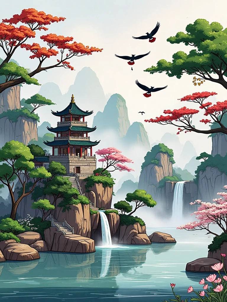 4. Traditional Chinese landscape painting style, including a pagoda on a rocky hill, a rainbow over a waterfall, cherry blossoms, and fluttering butterflies.