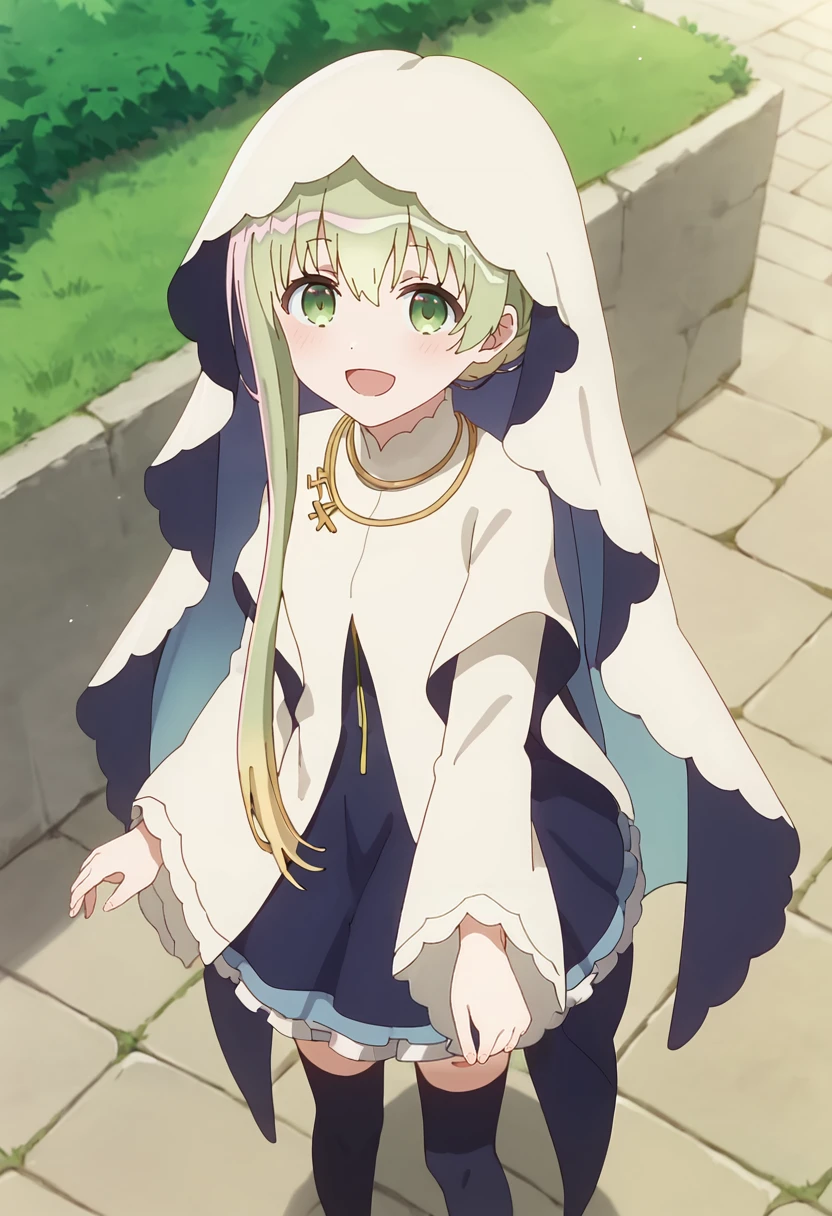 cecilia-default, cecilia \(shiro seijo to kuro bokushi\),green eyes,green hair,single sidelock,white veil,white dress,wide sleeves,black skirt,black thighhighs