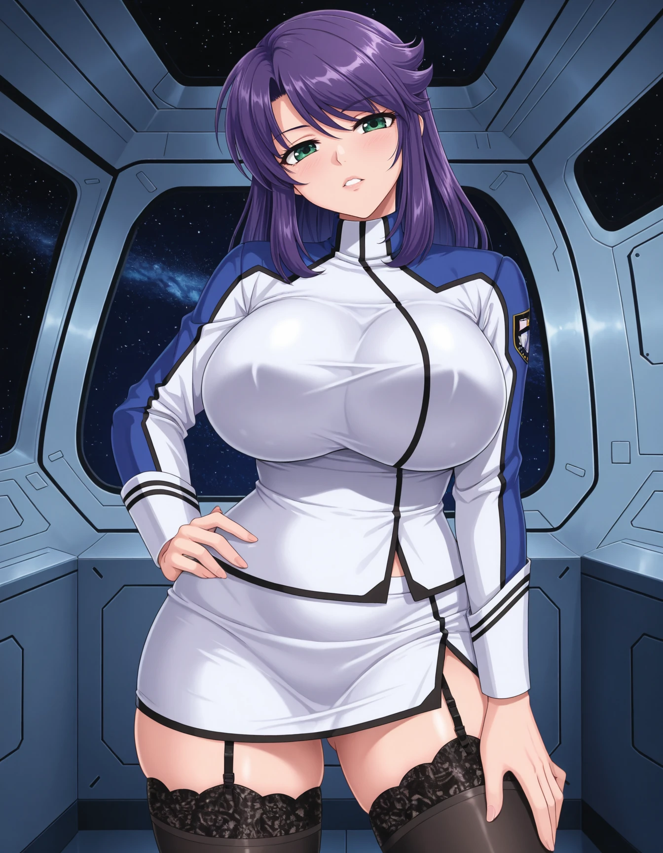 amazing quality,very aesthetic,absurdres,best quality,newest,masterpiece,4k resolution,detailed background,spacecraft,outerspace,<lora:Kusunoki_Rin_Style:0.9>,<lora:Kagami_Hirotaka_Style_Prison_Battleship_1:0.9>,2girls,1boy,lieri bishop,purple hair,green eyes,military uniform,long sleeves,white pencil skirt,black thighhighs,white ankle boots,huge breasts BREAK naomi evans,black hair,red eyes,short hair,military uniform,white pencil skirt,huge breasts,white ankle boots,black thighhighs,long sleeves BREAK donny boghan,brown hair,brown male eyes,military uniform,middle age male,white pants,holding each other waist,1boy,