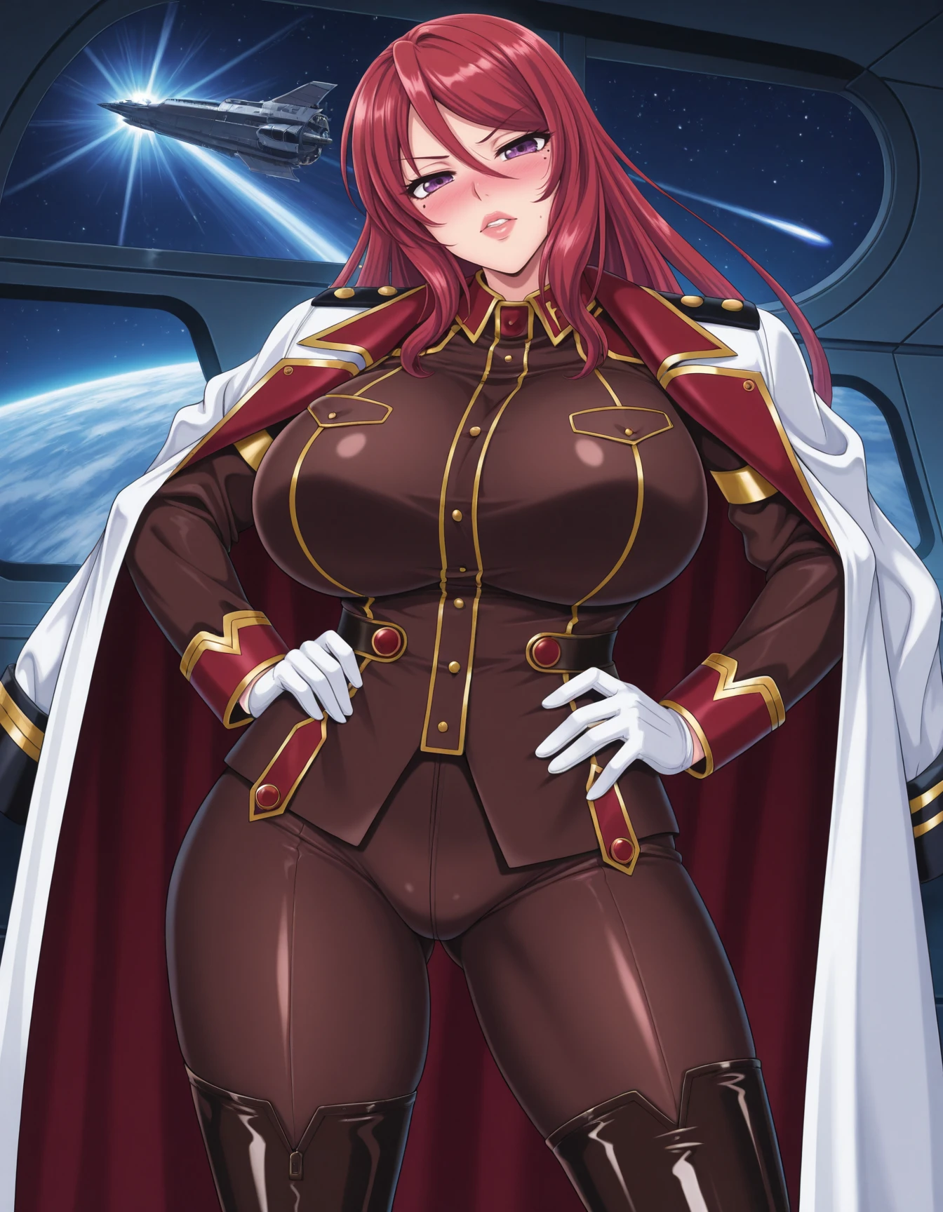 amazing quality,very aesthetic,absurdres,best quality,newest,masterpiece,4k resolution,detailed background,spacecraft,indoors,<lora:Kusunoki_Rin_Style:0.9>,<lora:Kagami_Hirotaka_Style_Prison_Battleship_23:0.9>,2girls,1boy,alicia_viewstroem,mature female,blush,blonde hair,long hair,red eyes,lipstick,green gem,red short dress,center opening,red gloves,red thigh boots,bodystocking,bare shoulders,curvy,huge breasts,thick thighs,red thigh boots BREAK Maya Cordelia,light smile,blush,orange hair,long hair,sidelocks,purple eyes,emerald gem,circlet,white short dress,center opening,detached collar,bodystocking,white gloves,white pleated skirt,black pantyhose,pink ankle boots,curvy,large breasts,thighs BREAK donny boghan,brown hair,brown male eyes,military uniform,middle age male,white pants,holding each other waist,1boy,