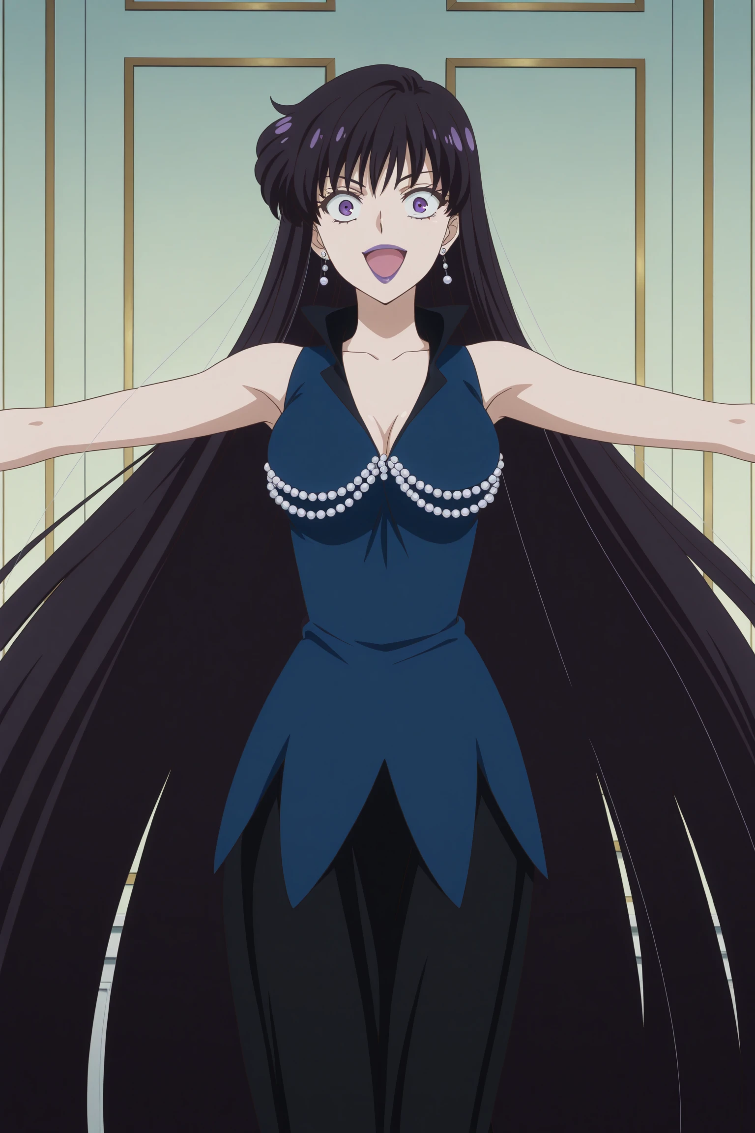 mistress 9, absurdly long hair, black hair, purple eyes, makeup, purple lips, earrings, long dress, sleeveless dress, collared dress, two-tone dress, jewelry, pearl (gemstone)