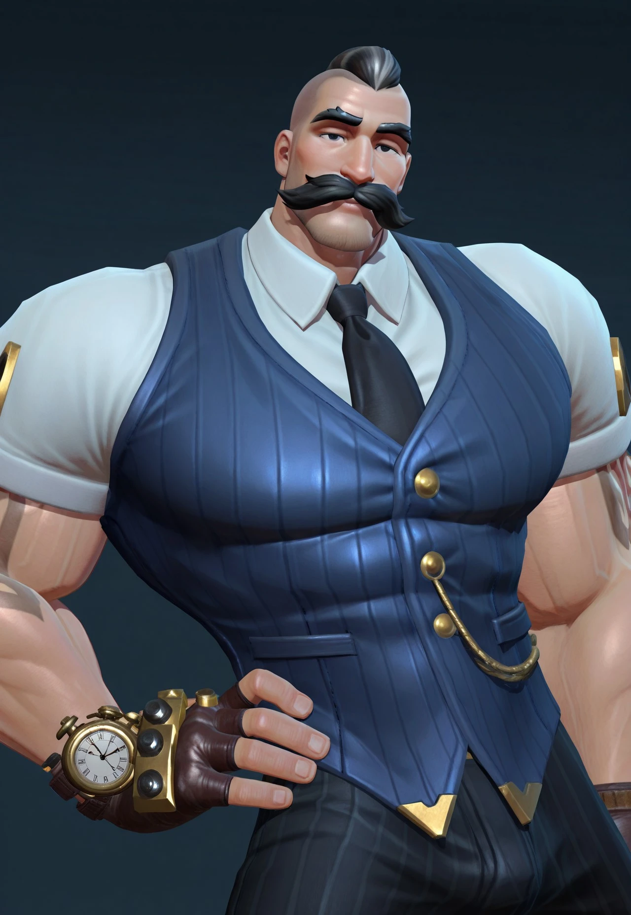 blue pinstripe vest, white collared shirt, rolled-sleeve, black tie, gold buttons, pocket watch chain, black tailored pants, brown leather shoes, fingerless gloves, leather gloves, steampunk wristwatch