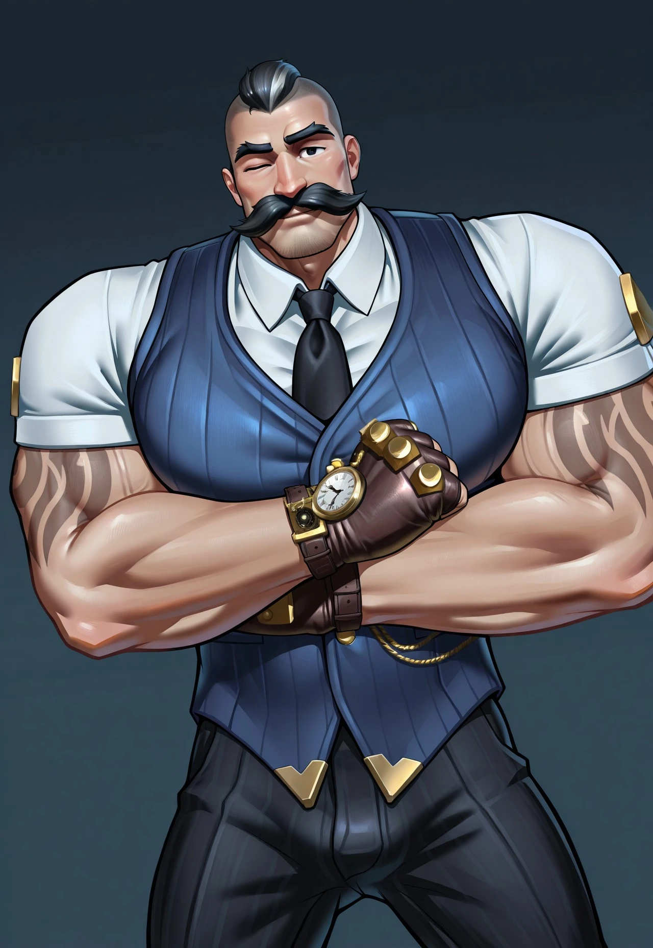 br4um, black eyes, thick eyebrows, black hair with white streak, mohawk hairstyle, slicked back hair, thick mustache, stubble, arm tattoo,