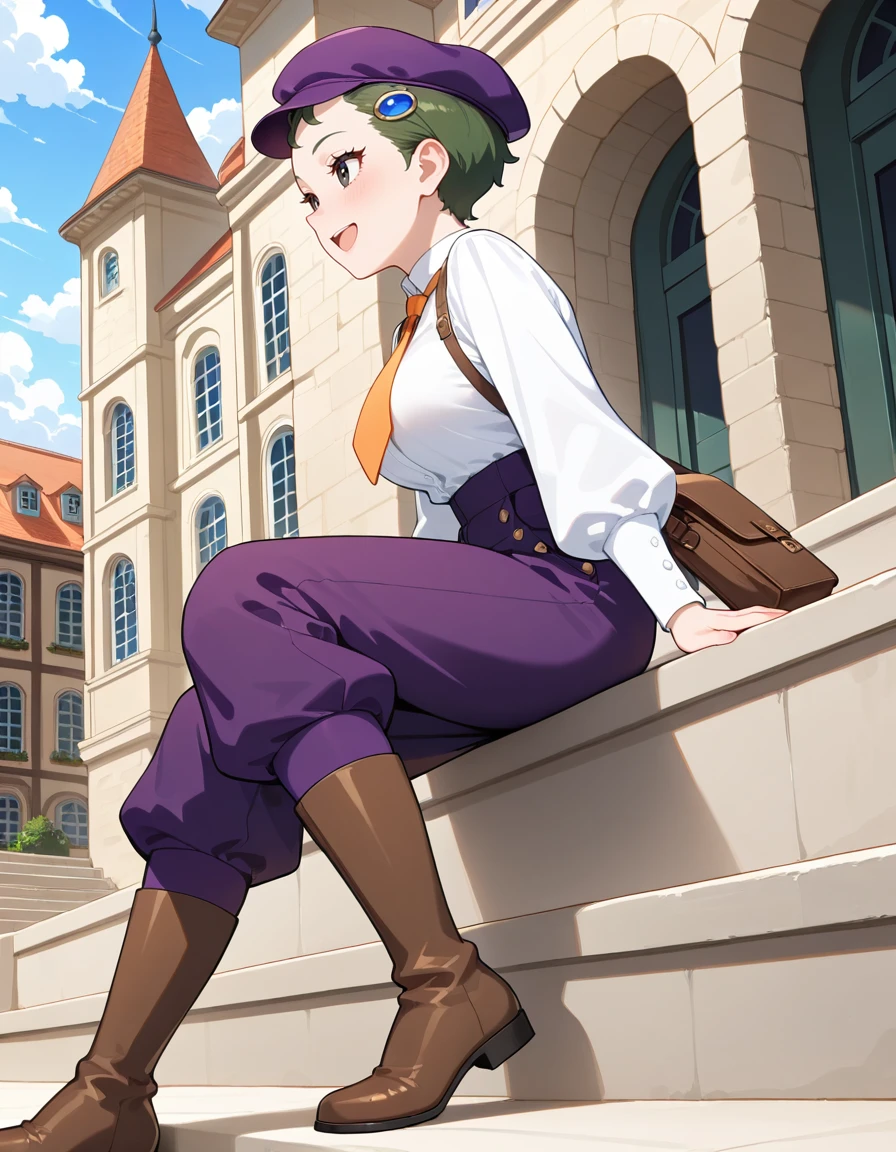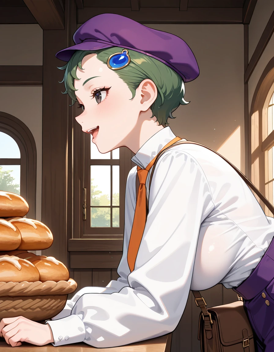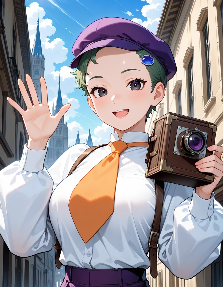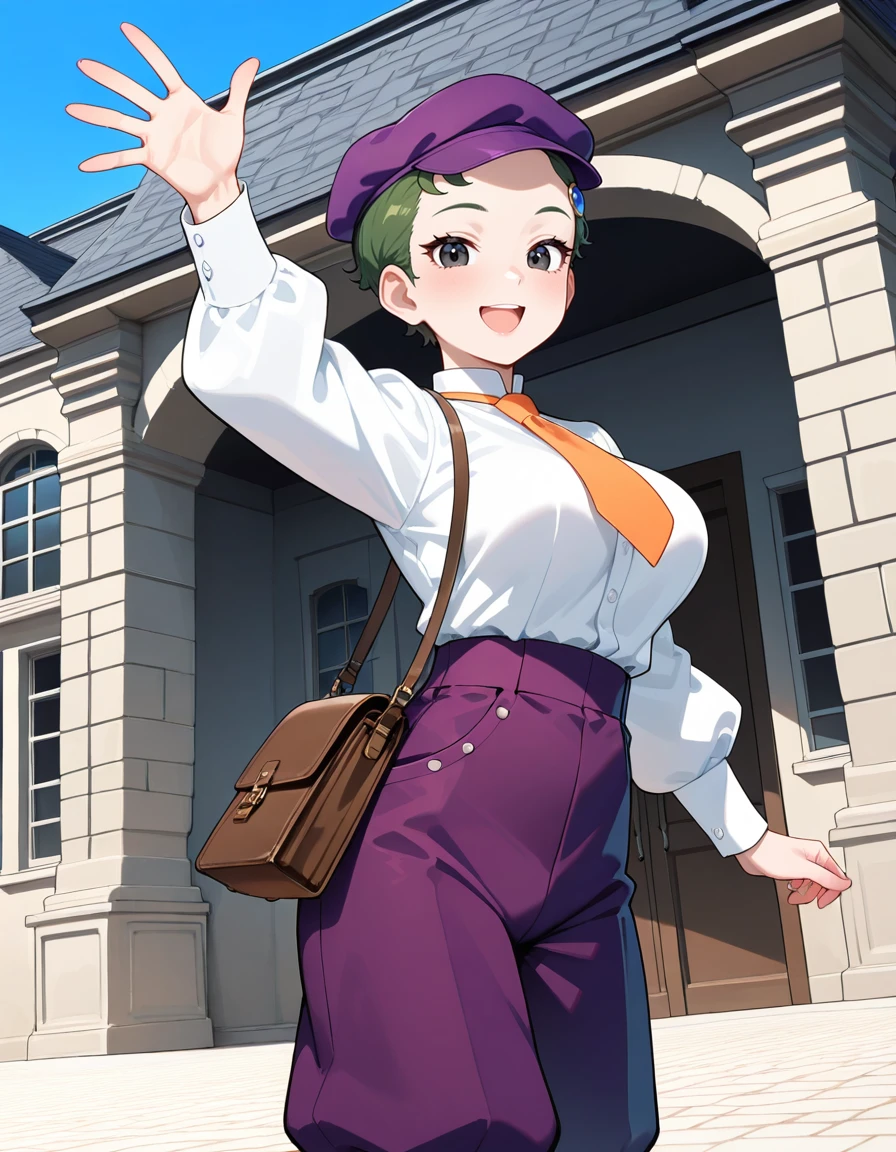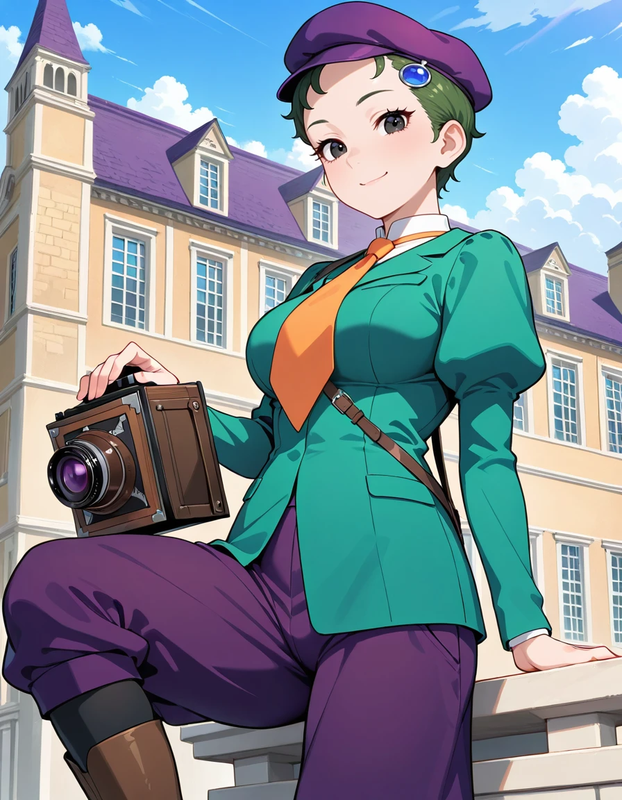 (fran-doll), (official style, black eyes, eyelashes, dark green hair, very short hair, blue hair ornament, large breasts), (purple cabbie hat, orange necktie, purple puffy pants, brown boots)