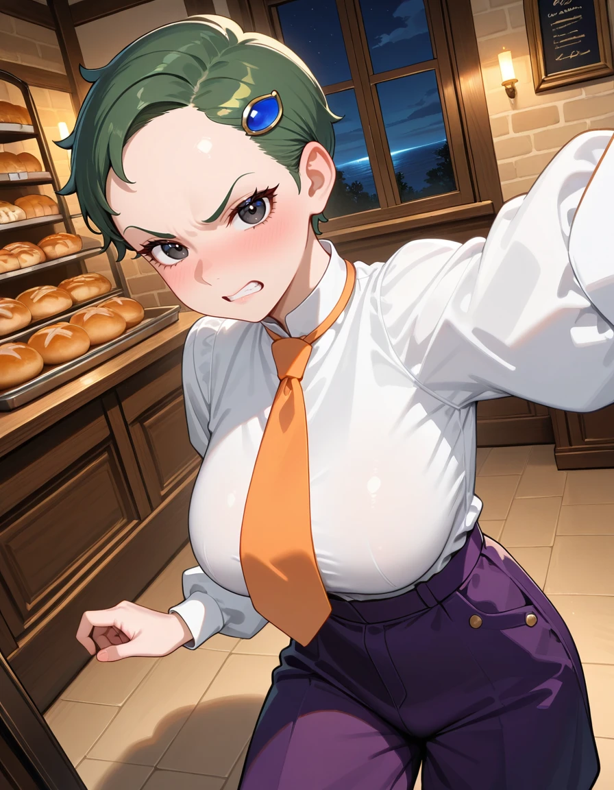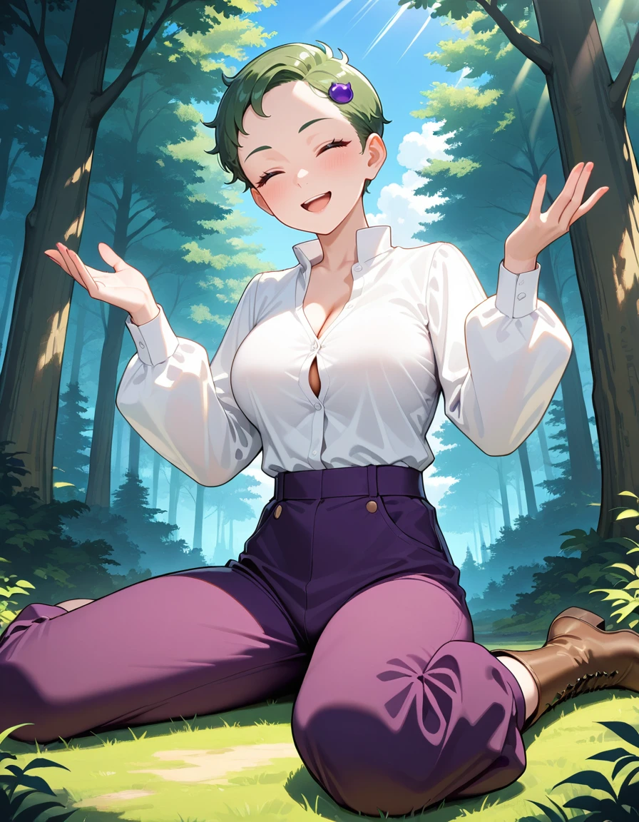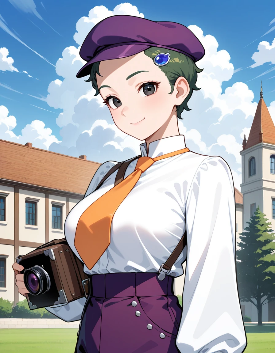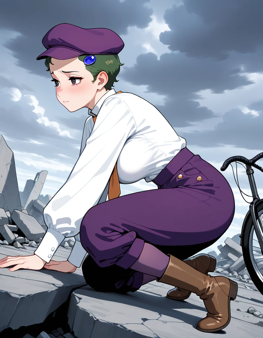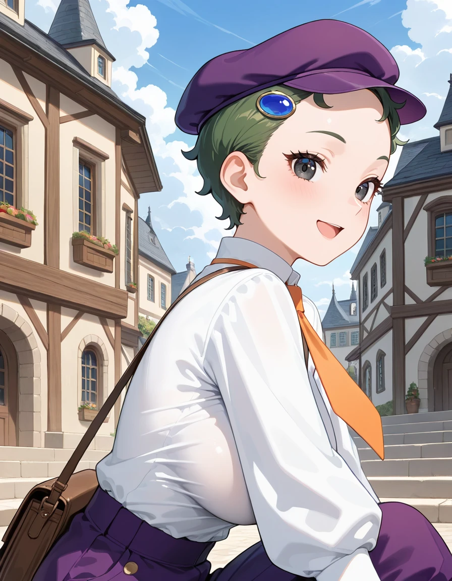 (fran-doll), (official style, black eyes, eyelashes, dark green hair, very short hair, blue hair ornament, large breasts), (purple cabbie hat, orange necktie, purple puffy pants, brown boots)