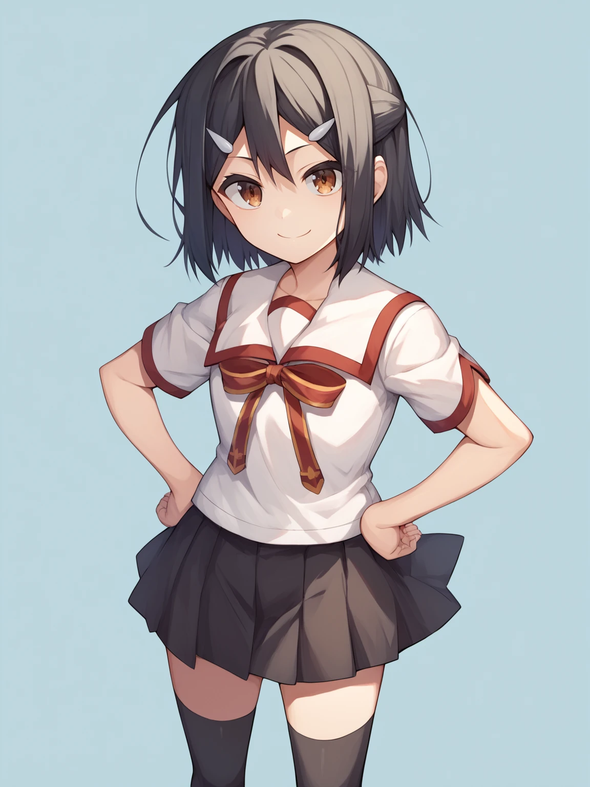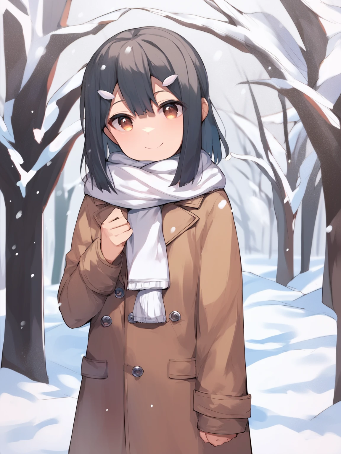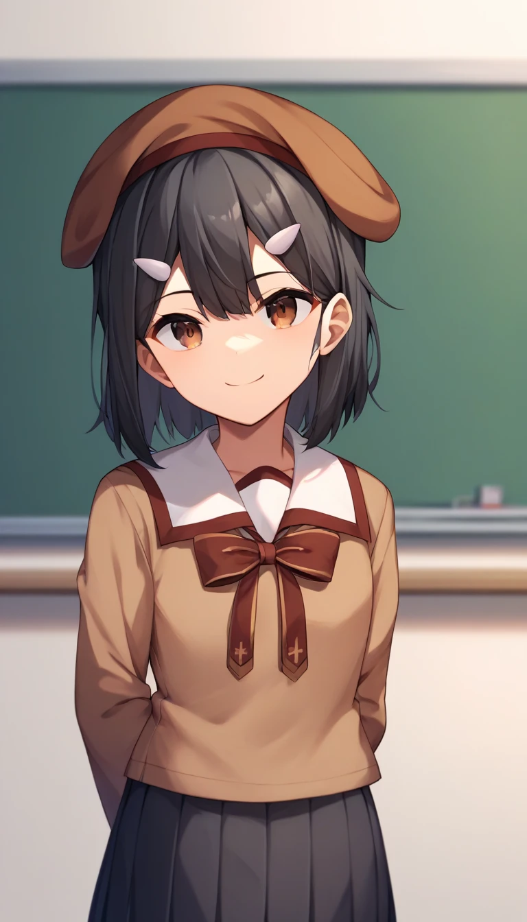 Basic prompts : 1girl, black hair, brown eyes, hairclip, bangs