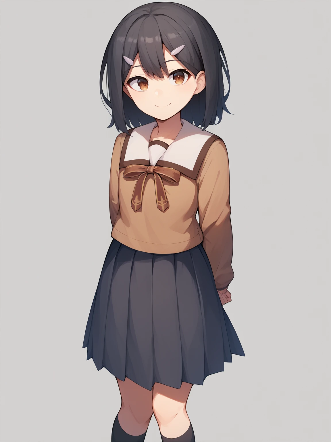 Brown school uniform prompts : miyuschoolb, brown school uniform, long sleeves, skirt, black socks, shoes
