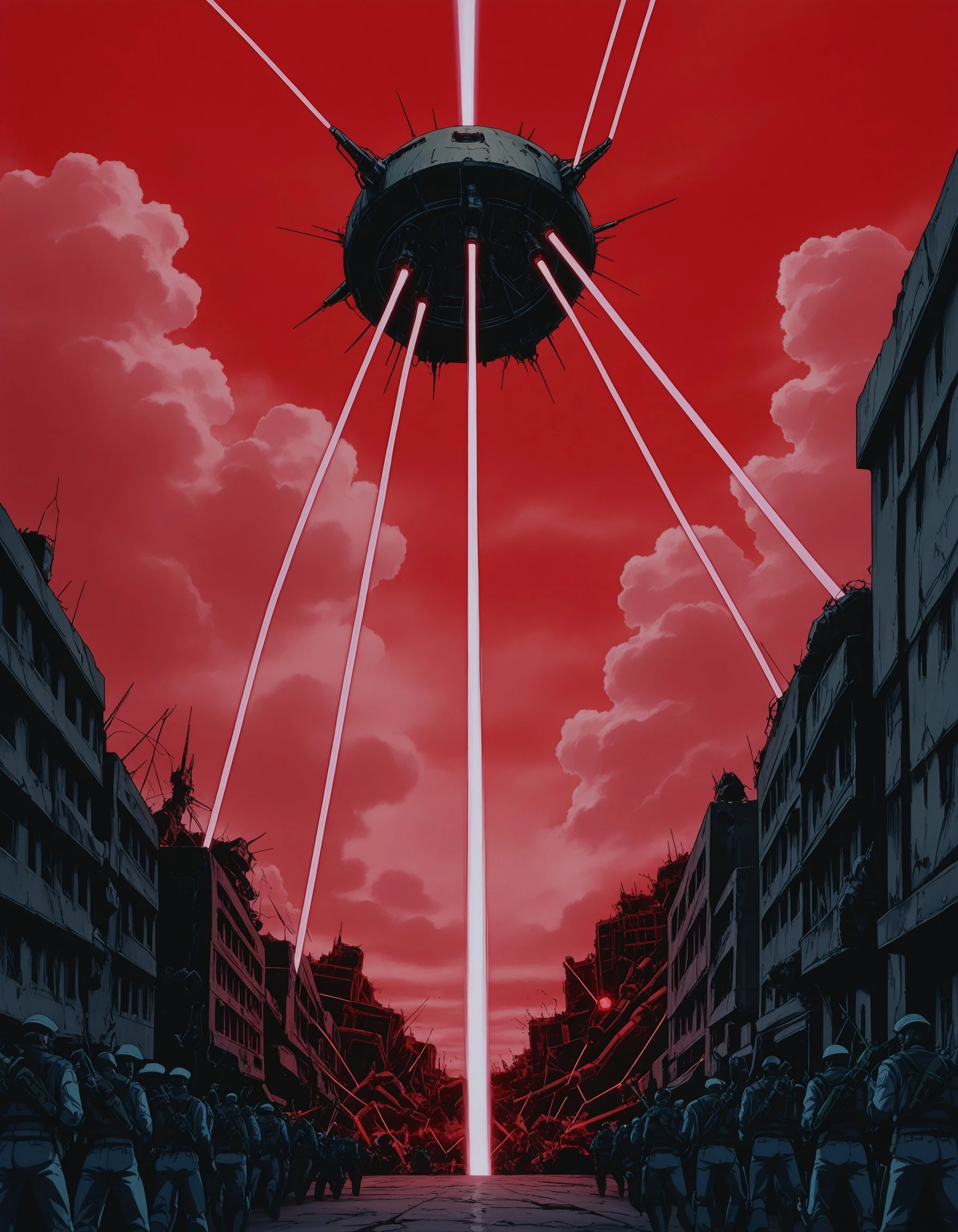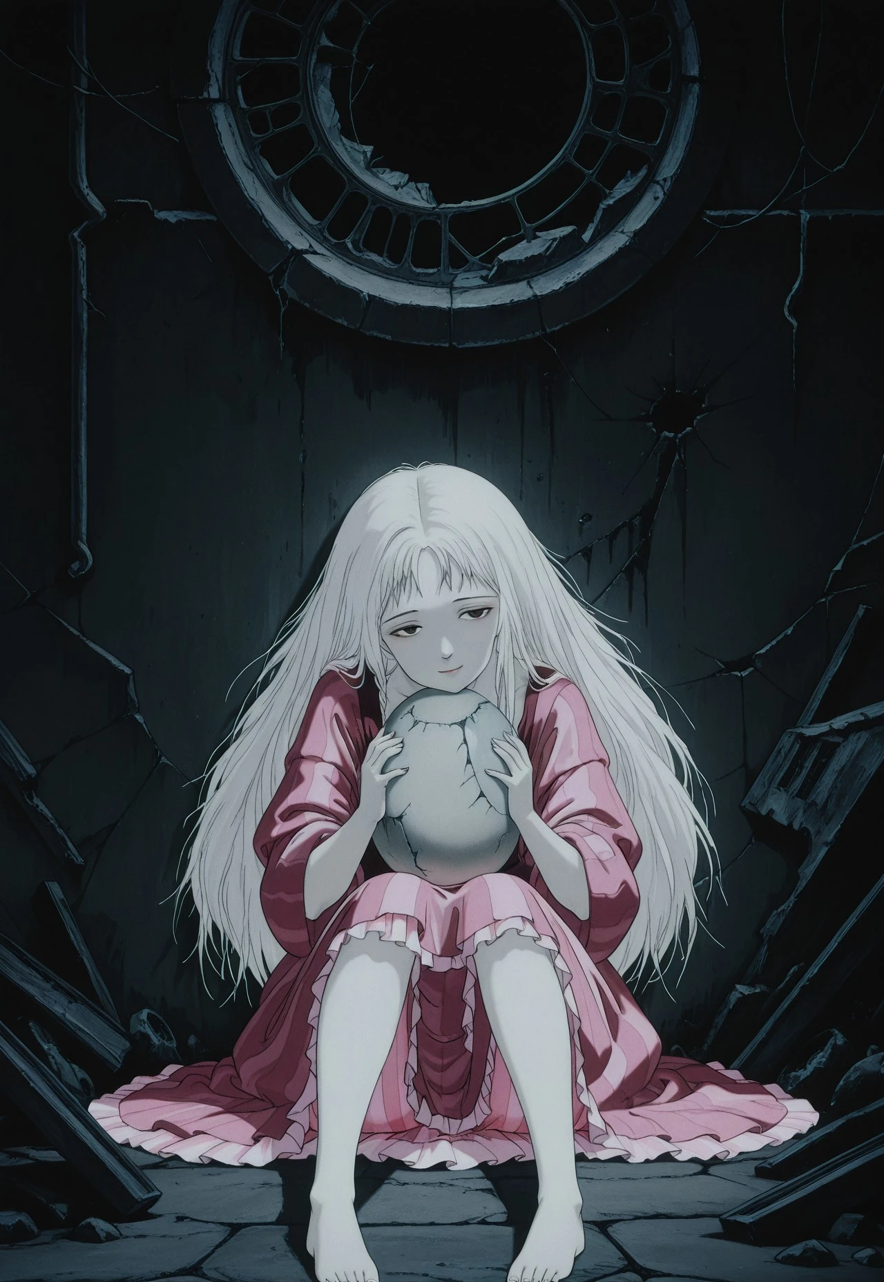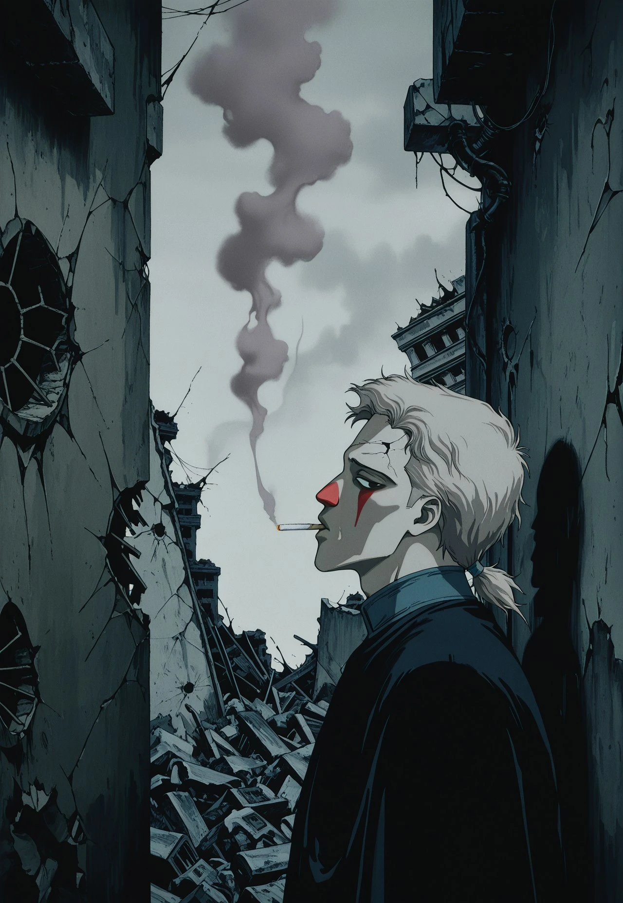 Used/useful tags: solo, white hair, 1girl, long hair, g1rl, 1boy, dark, holding, scenery, b0y, black background, no humans, ruins, red sky, expressionless, holding weapon, weapon over shoulder