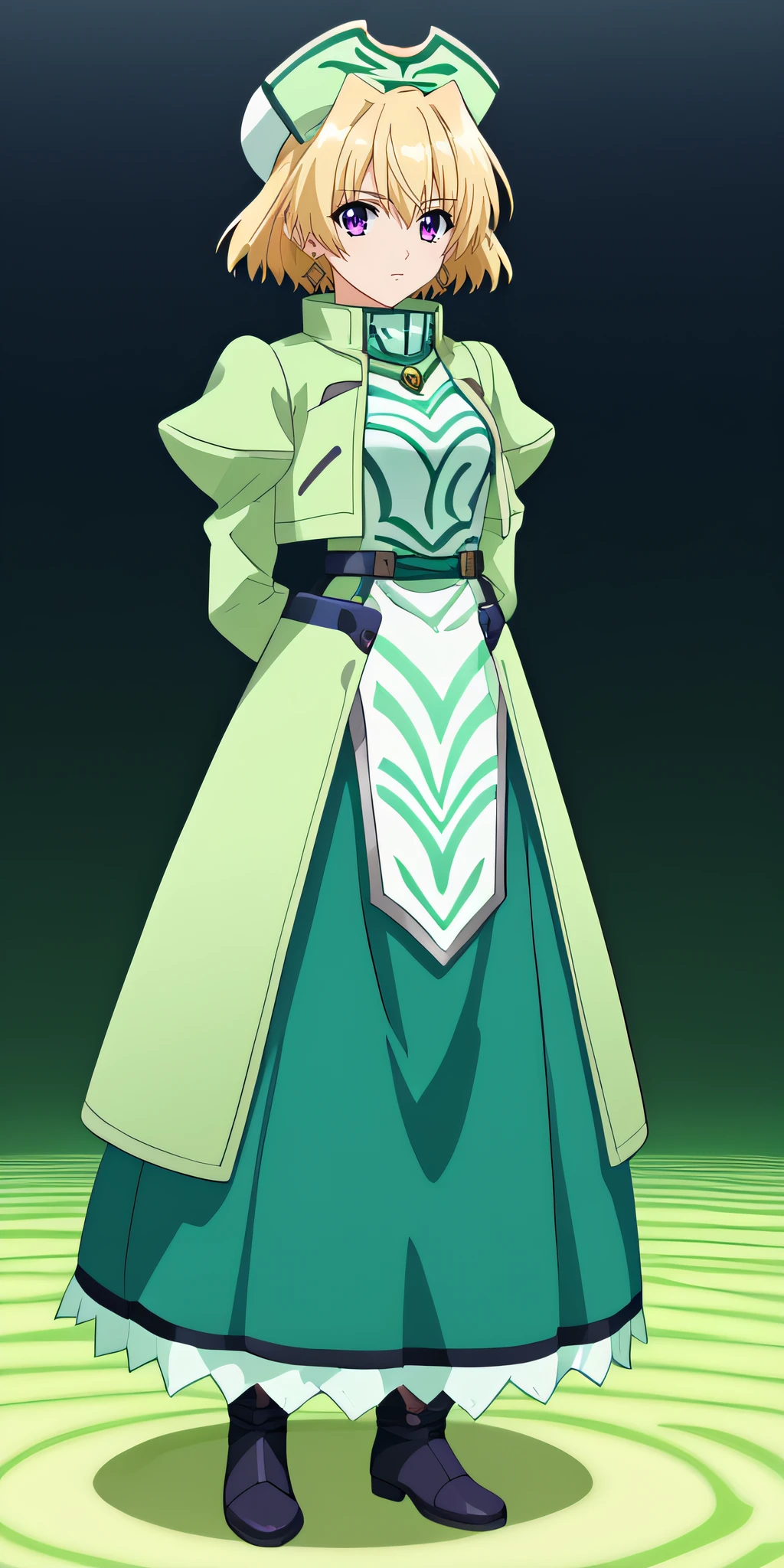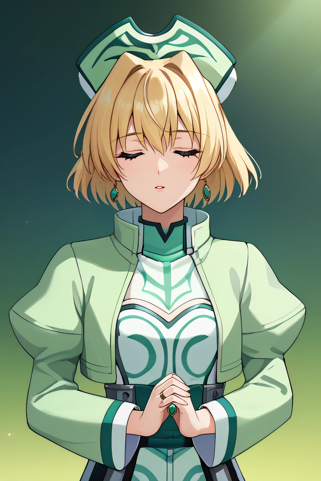 jewlery, ring, gem, green nursing cap, armored dress, armor, light green jacket, white dress, long sleeves, layered dress