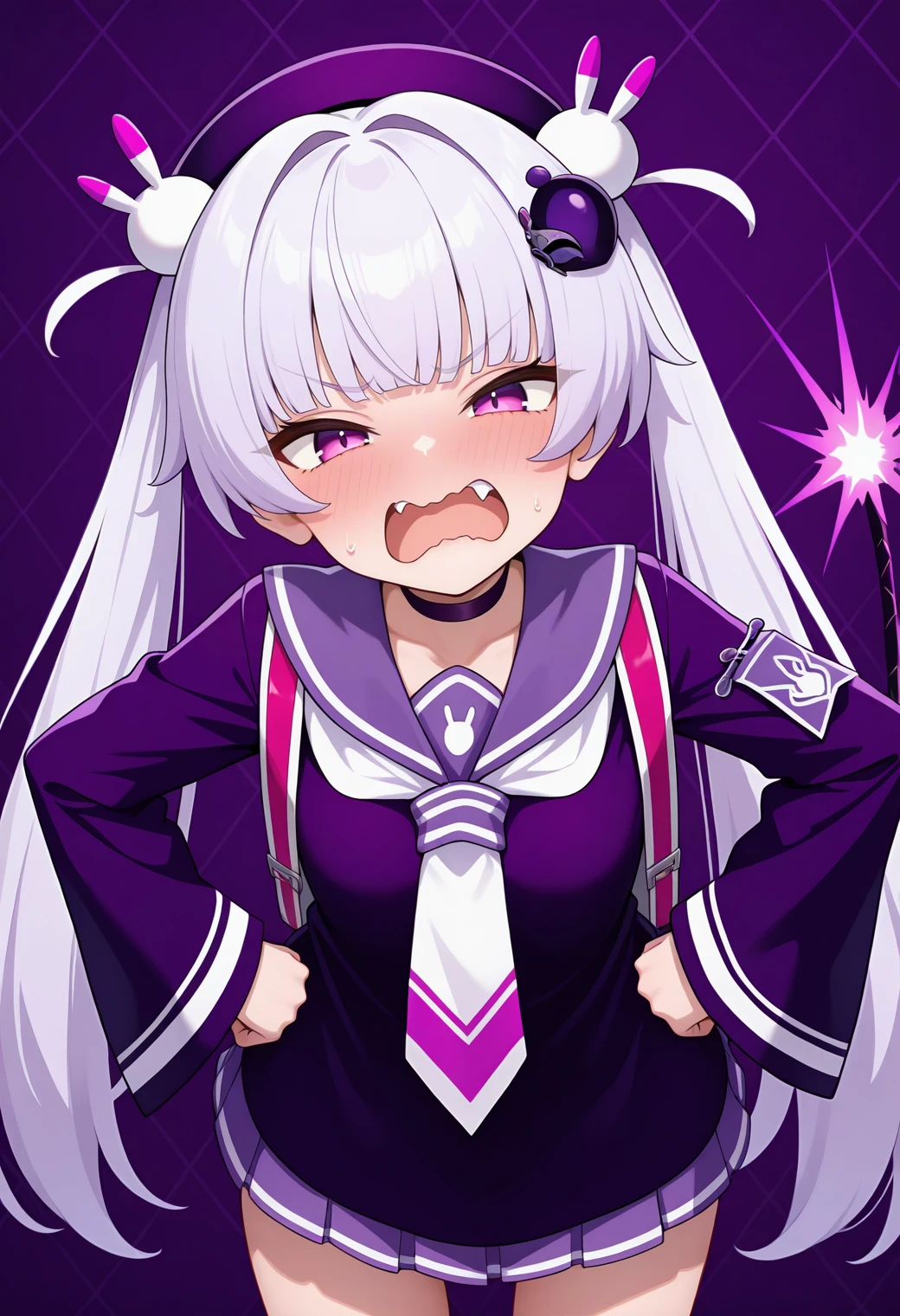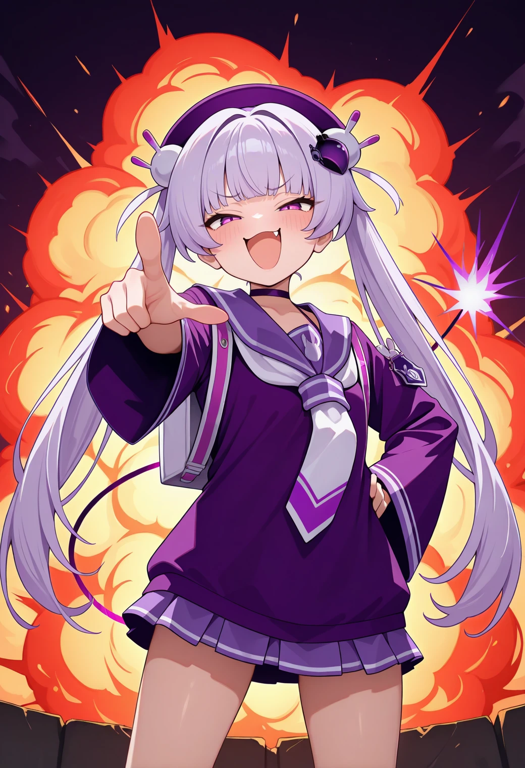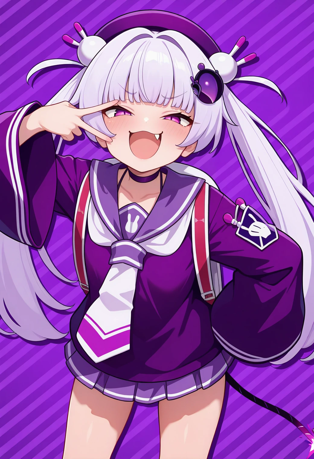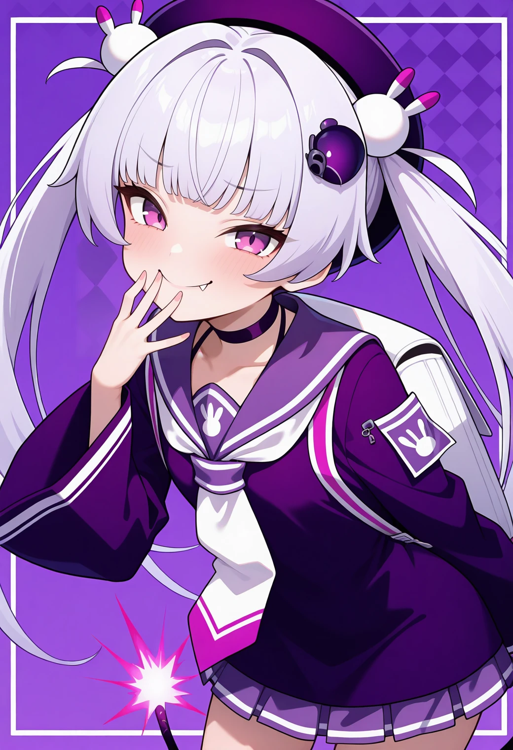 daakubg, twintails, hair ornament, fang, hat, choker, purple school uniform, purple shirt, long shirt, wide sleeves, skirt, fuse tail, backpack, purple socks, uwabaki,