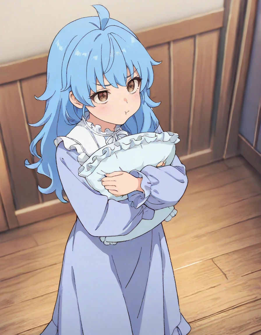 alternate hairstyle 2, side ponytail, blue pajamas, white frills, long sleeves, puffy sleeves, long dressDescription