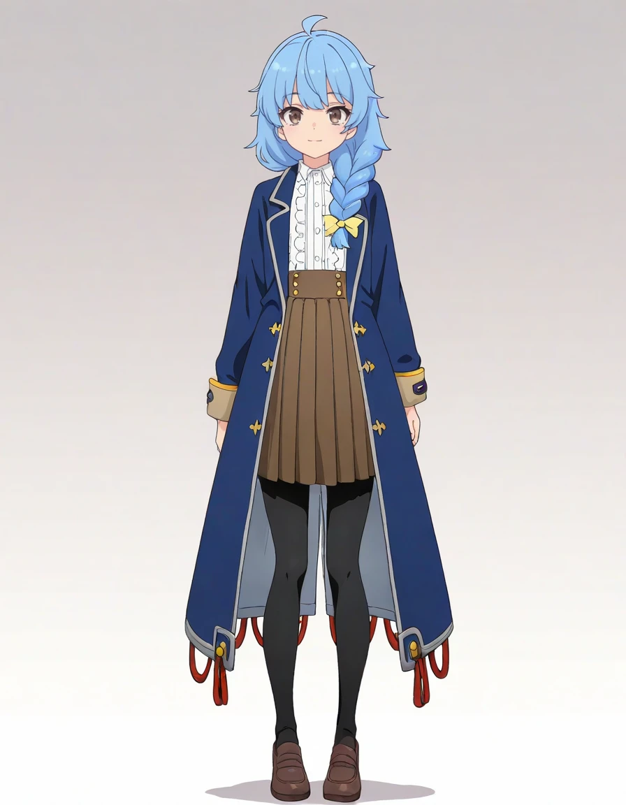 single braid, yellow hair ribbon, hair over shoulder, adventurer outfit 1, blue coat, white collared shirt, center frills, long sleeves, brown pleated skirt, black pantyhose, brown loafersOutfit - Adventurer 2