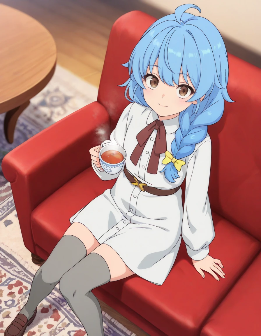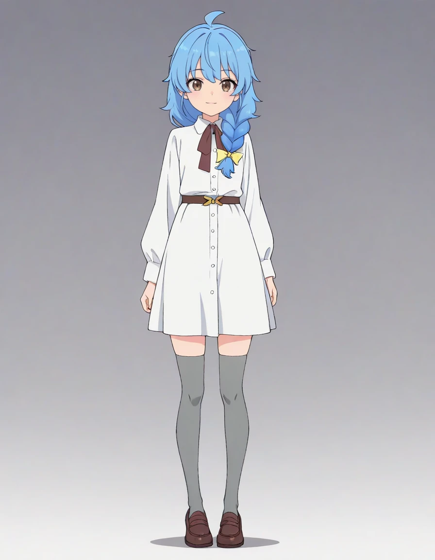 single braid, yellow hair ribbon, hair over shoulder, casual outfit, white collared dress, brown neck ribbon, long sleeves, belt, grey thighhighs, brown loafersOutfit - Pajamas