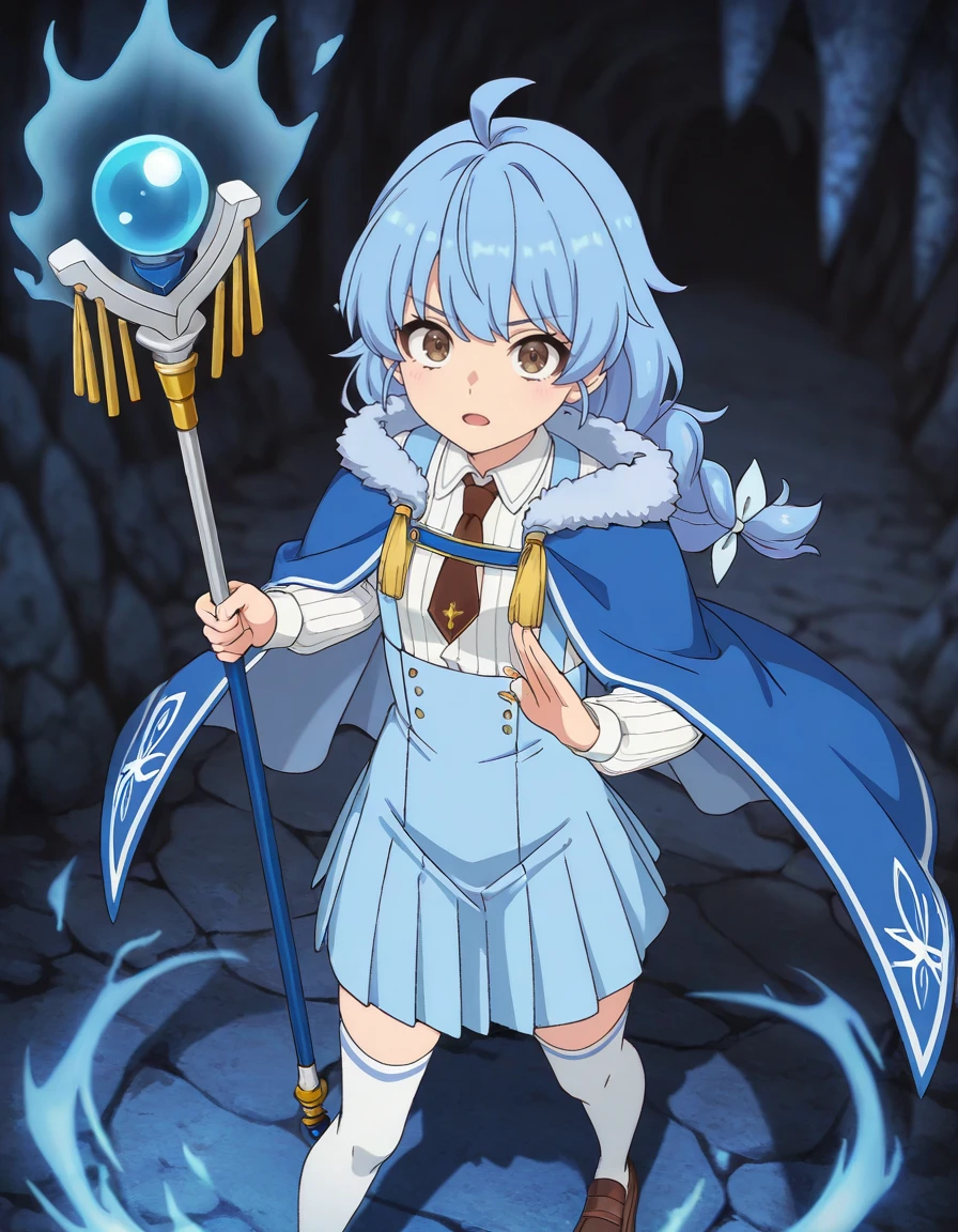 alternate hairstyle, adventurer outfit 2, fur-trimmed blue cape, tassel, white collared shirt, brown necktie, blue suspender skirt, long sleeves, white thighhighs, brown loafersOptional