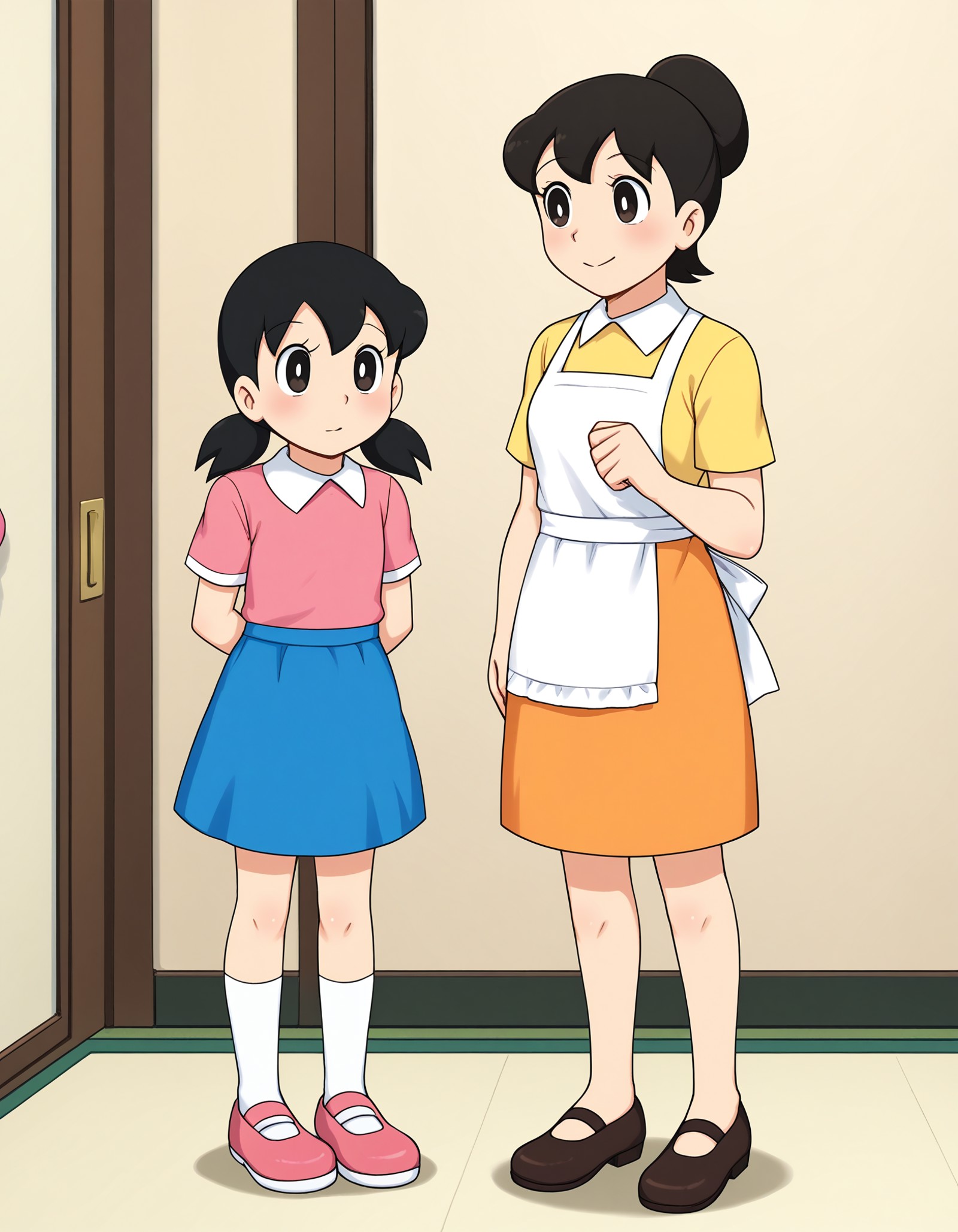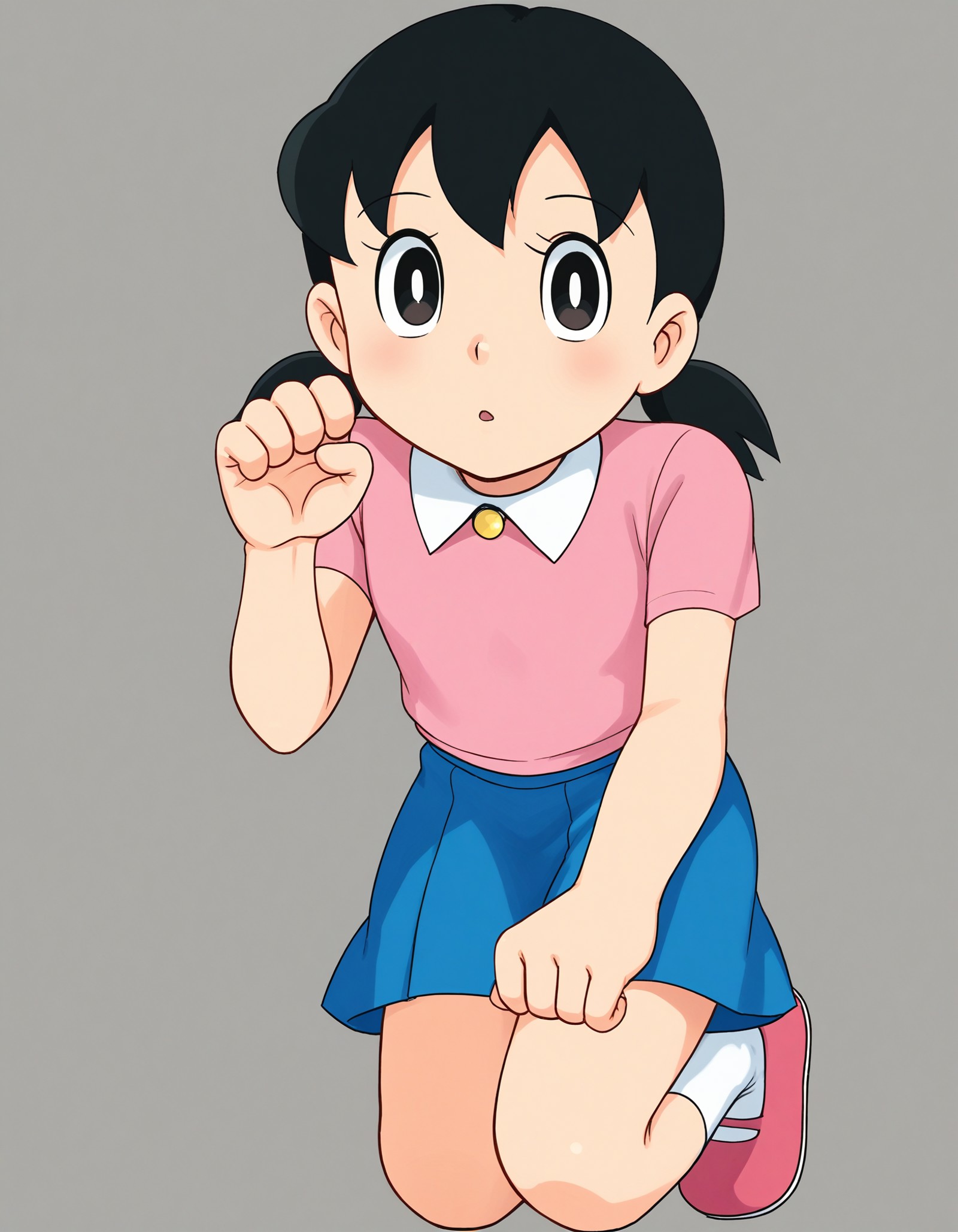 minamoto shizuka \(doraemon\), black hair, low twintails, short twintails, black eyes, pink shirt, white collar, blue skirt, white kneehighs, pink shoes
