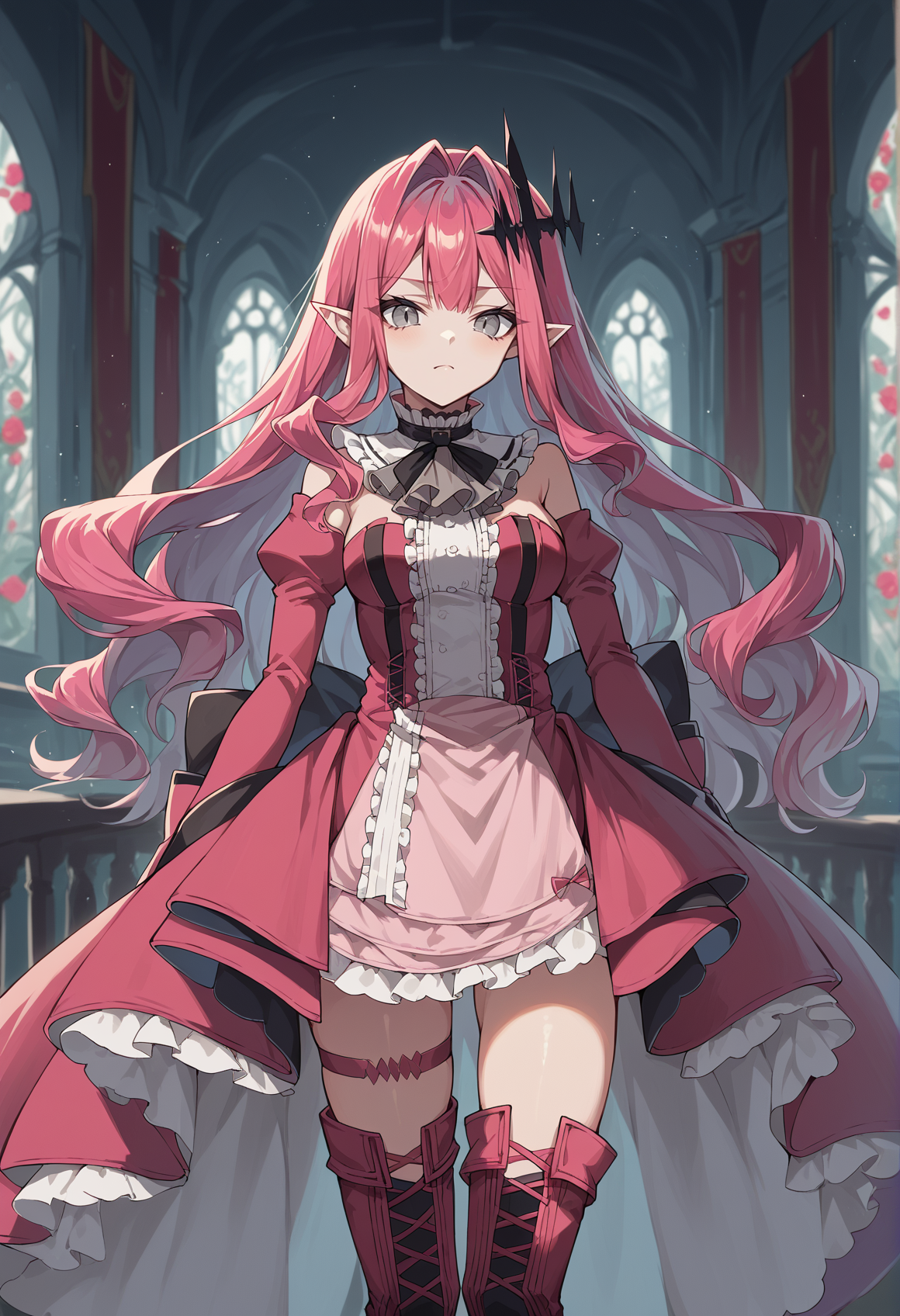ointy ears, pink hair, very long hair, grey eyes, multicolored hair, gradient hair, grey hair, character hood,