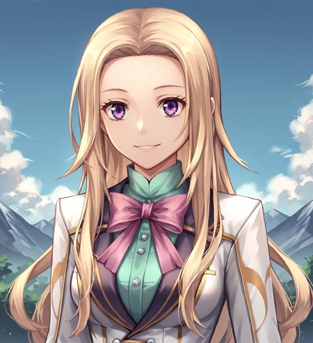 Lucy Seiland, blonde hair, long hair, swept bangs, forehead, purple eyes, medium breasts,