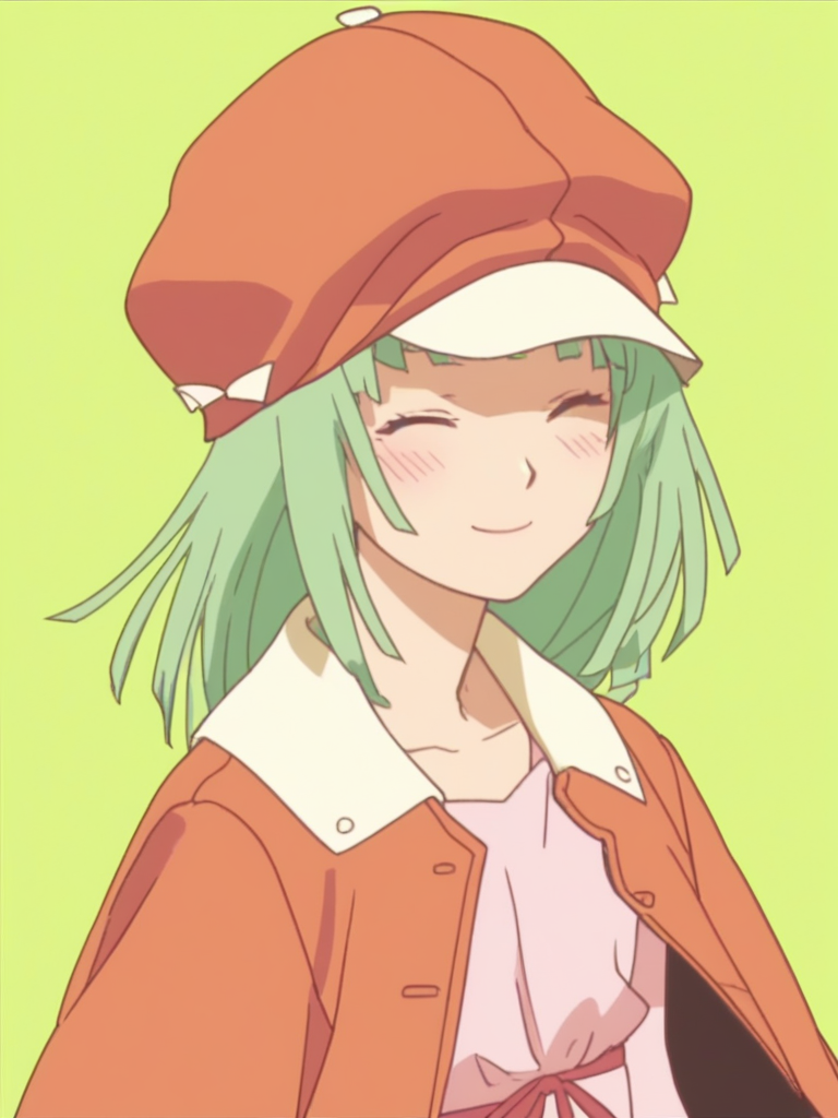 green hair, hat, cabbie hat, closed eyes, jacket, jacket on shoulders