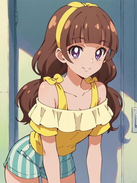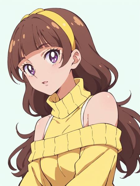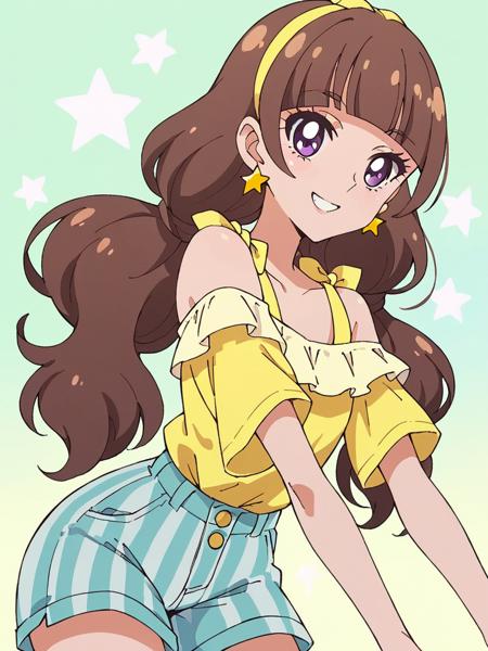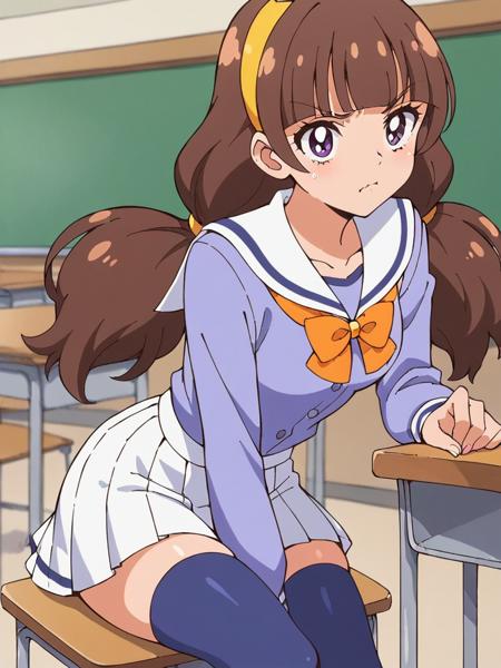 Keywords: Amanogawa Kirara, brown hair, blunt bangs, long hair, low twintails, yellow hairband, purple eyes,