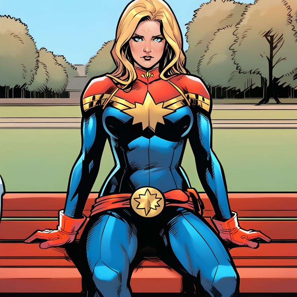 blonde hair, blue eyes, bodysuit, star logo, red gloves, red belt,