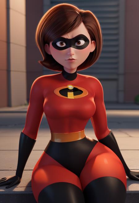 helenparrSDXL,1girl,short hair,brown hair,thighhighs,gloves,brown eyes,red bodysuit,superhero,domino mask,black gloves,cowboy shot,