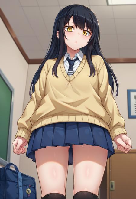 yotsuyamikoSDXL,1girl,long hair,black hair,long sleeves,school uniform,yellow eyes,white shirt,pleated skirt,necktie,collared shirt,miniskirt,sweater,blue skirt,kneehighs
