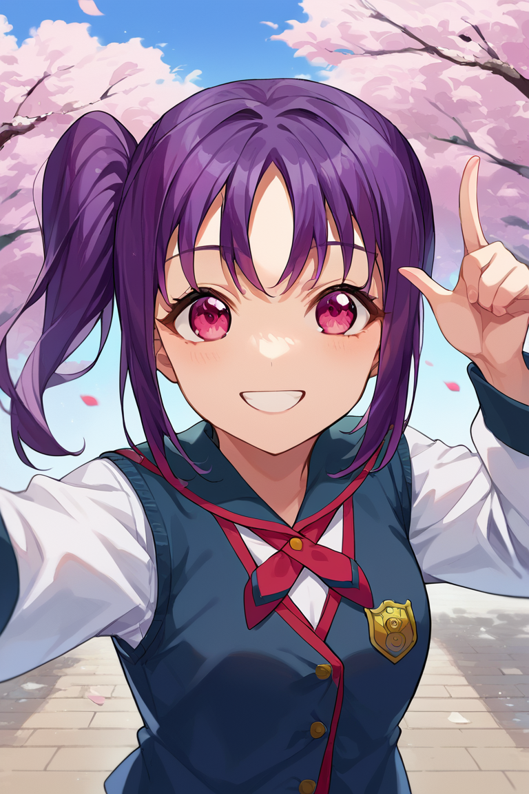 Sarah Kazuno, purple hair, side ponytail, pink eyes, hair scrunchie, white scrunchie,