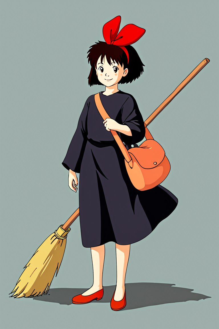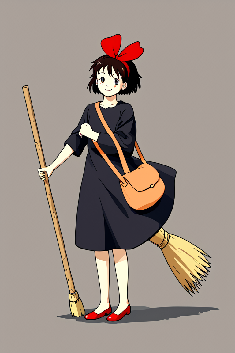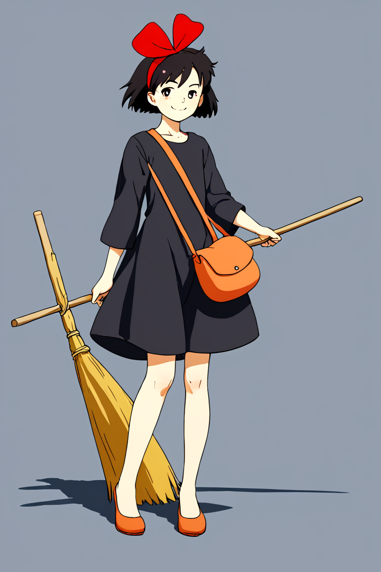hairband, shoes, bag, black dress, broom, witch, flats, kiki (majo no