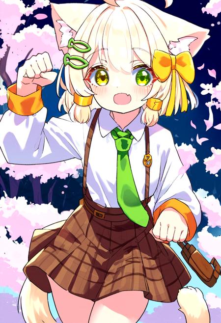 hazakurahinata,1girl,heterochromia,yellow eyes,green eyes,blonde hair,long hair,hair ornament,fish hair ornament,ahoge,cat tail,cat ears animal ear fluff,