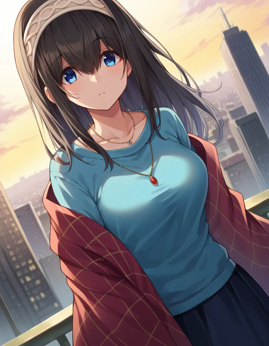 blue sweater, collarbone, jewelry, necklace, shawl, sweater, skirt,