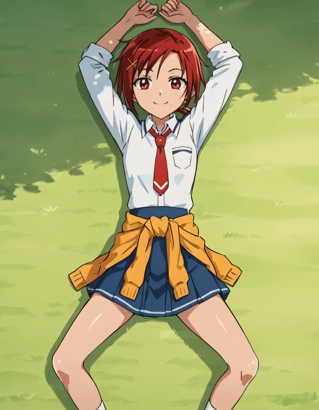 school uniform, white shirt, long sleeves, red necktie, blue skirt, sleeves rolled up, sweater around waist,