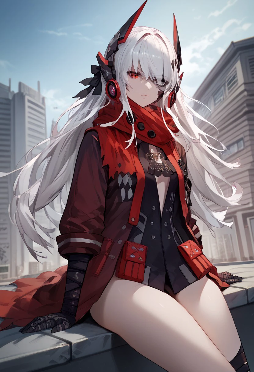 CrimsonAbyss, Heterochromia, red eye, grey eye, white hair, Crimson clothes, headgear, bandaged leg