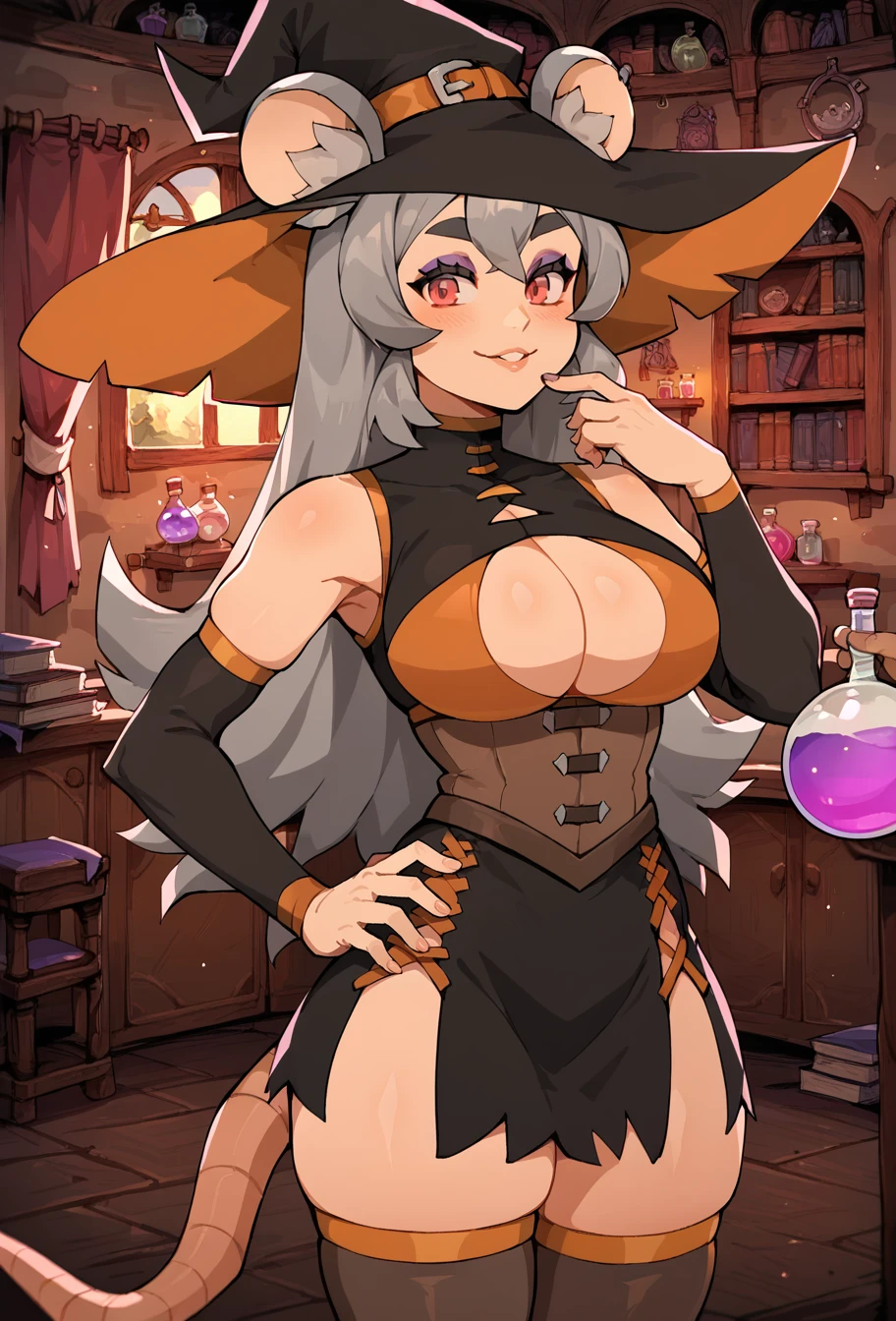 bootoob, long grey hair, red eyes, purple eyeshadow, mouse_animal_ears, large breasts,
