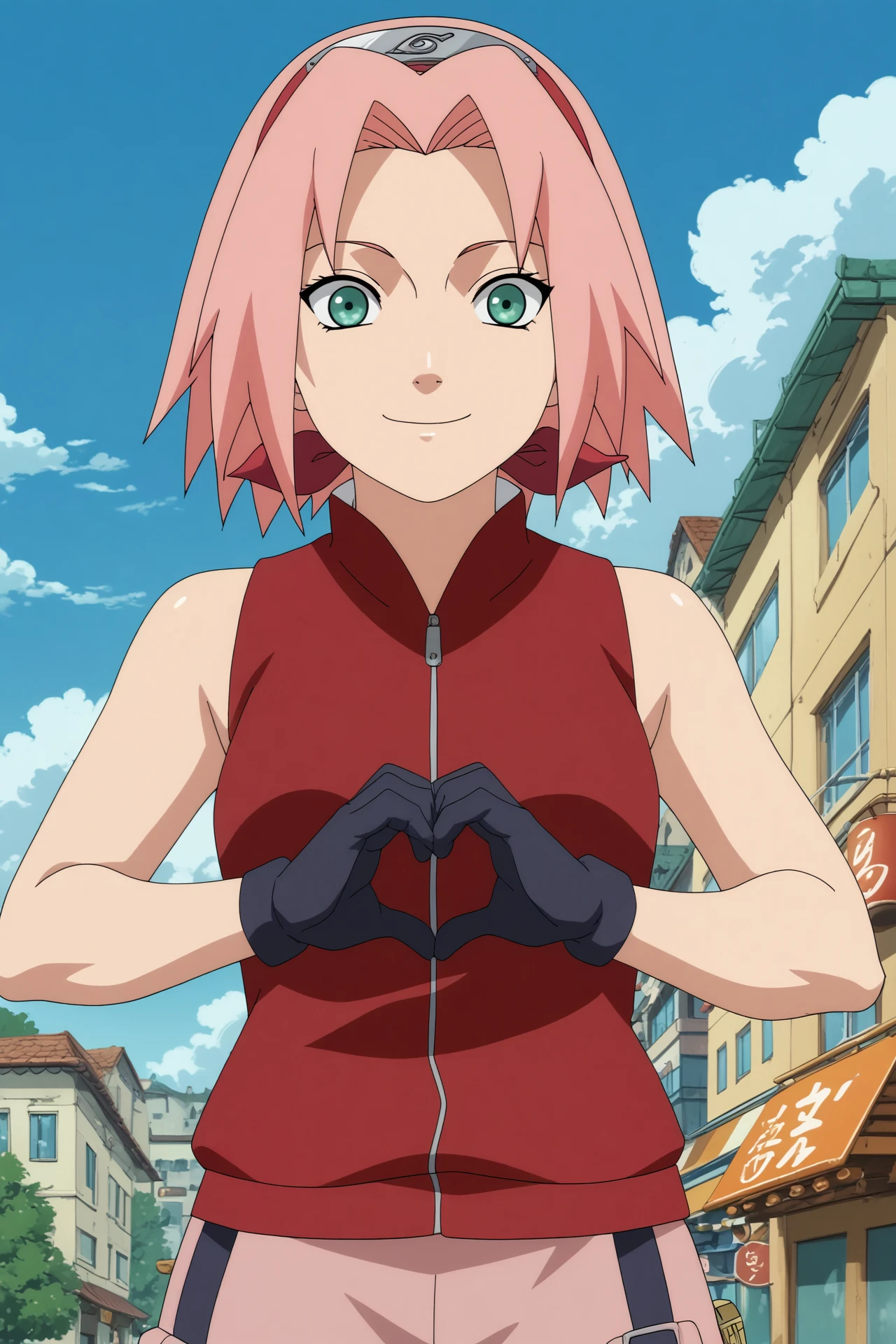 sakura haruno,1girl,solo,looking_at_viewer, sleeveless,forehead protector,hairband, black_gloves, bare_shoulders, red_shirt, konohagakure symbol,short hair