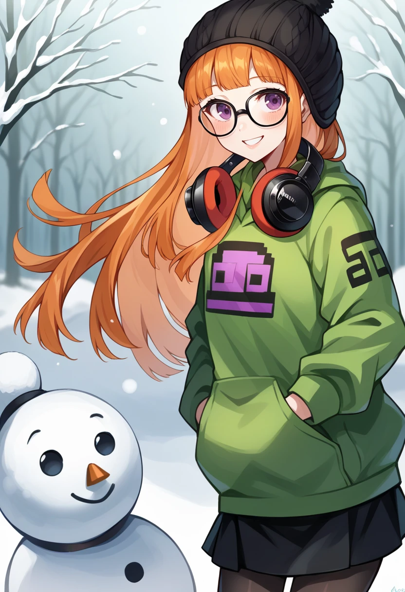 futabawinter, orange hair, long hair, blunt bangs, purple eyes, glasses, headphones around neck, black beanie, green hoodie, black skirt, black pantyhose,