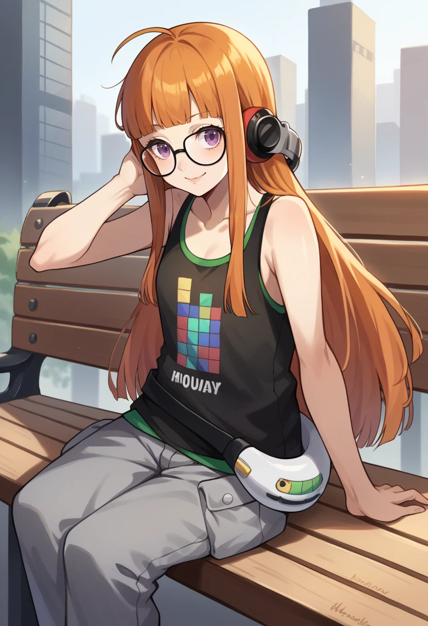 futabasummer, orange hair, long hair, blunt bangs, glasses, ahoge, purple eyes, behind-the-head headphones, black tank top, grey cargo pants,